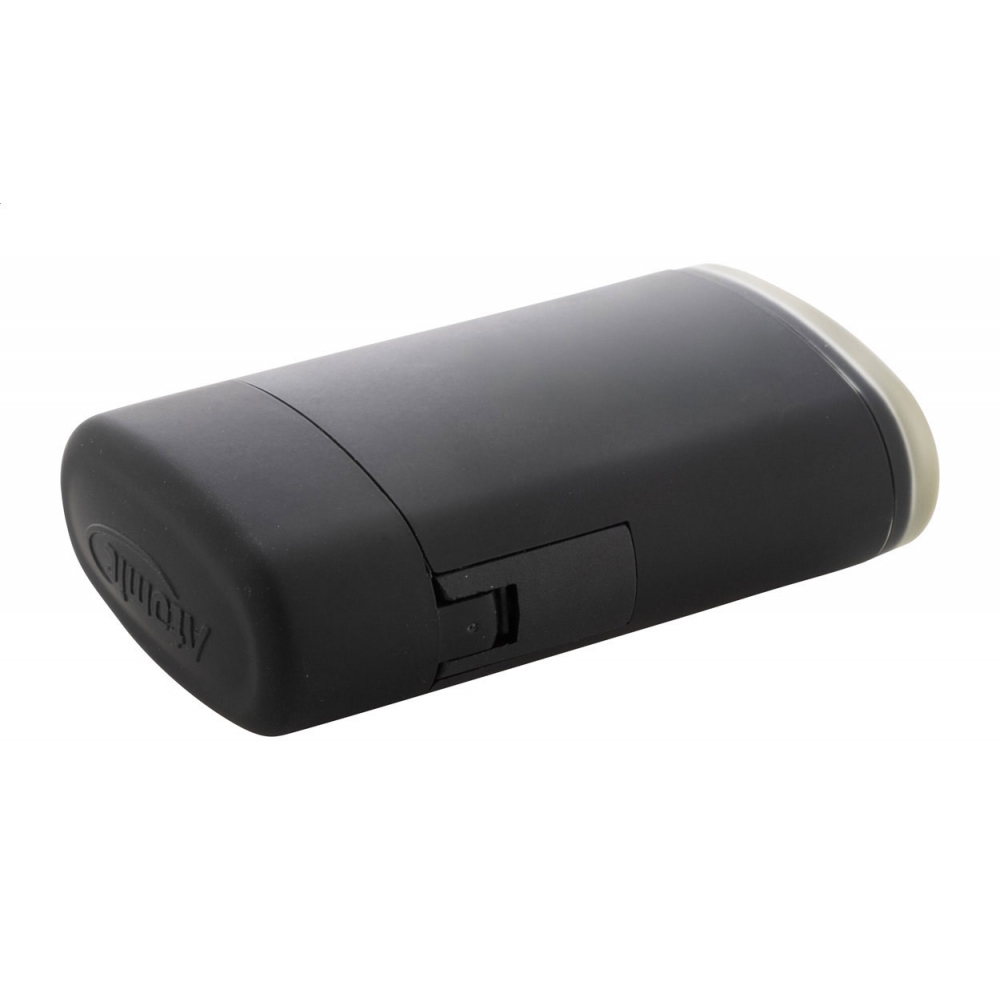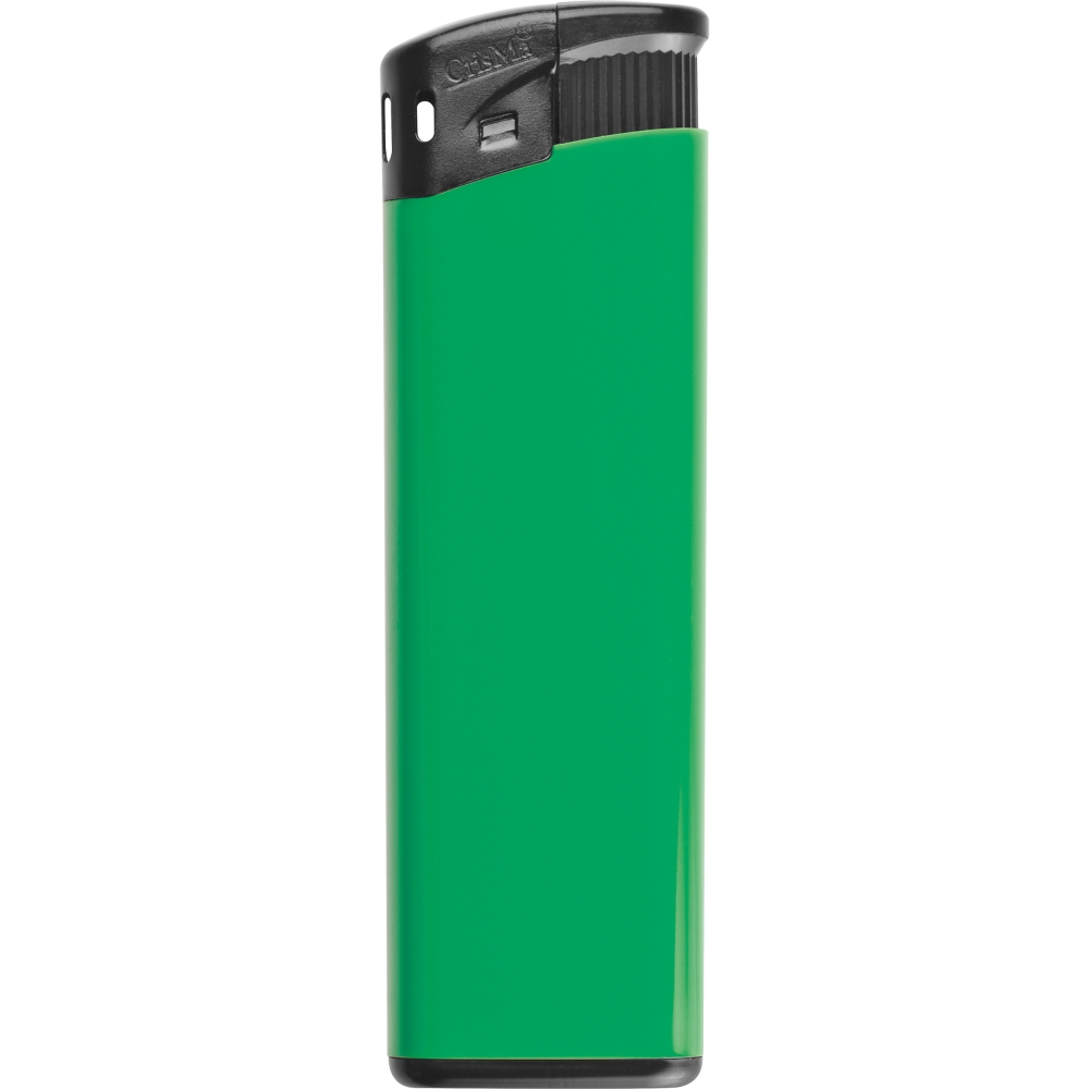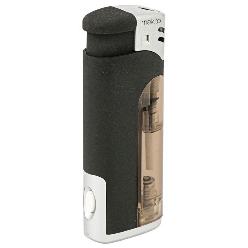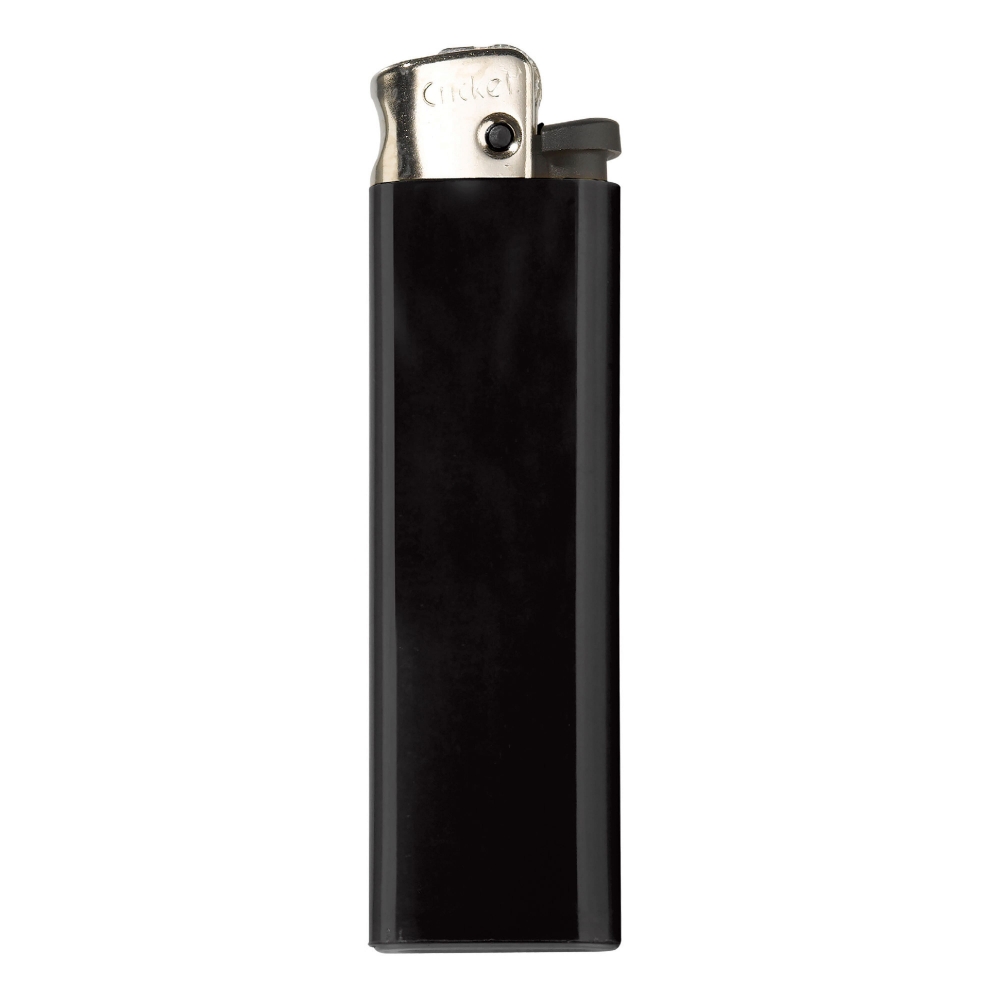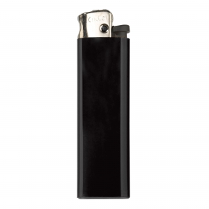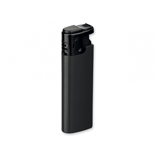 Elektronik-Feuerzeug mit schwarzem Kopf, nachfüllbar. Die Sturmflamme lässt sich stufenlos verstellen. Ihr Werbeaufdruck erfolgt auf einer Seite.