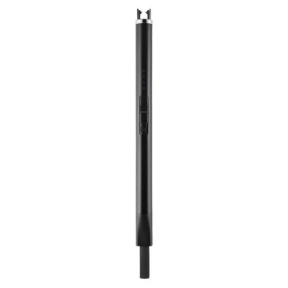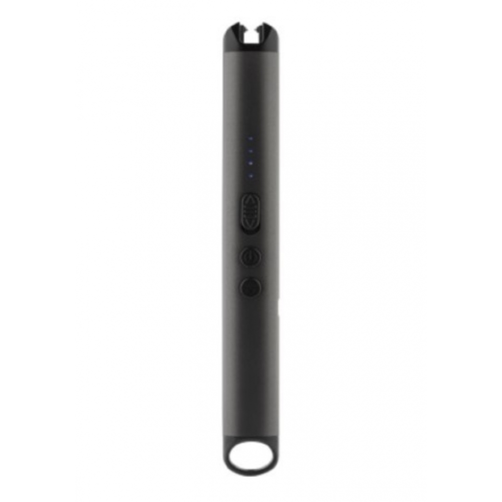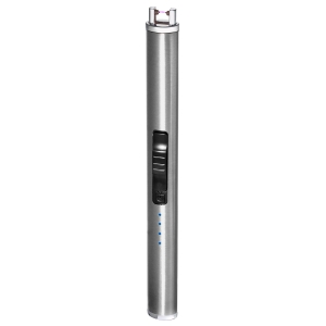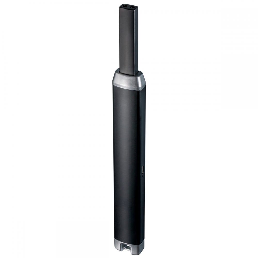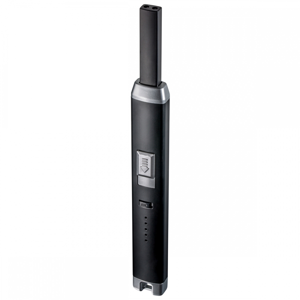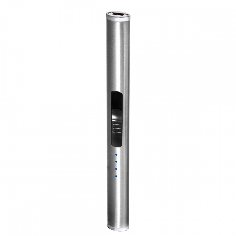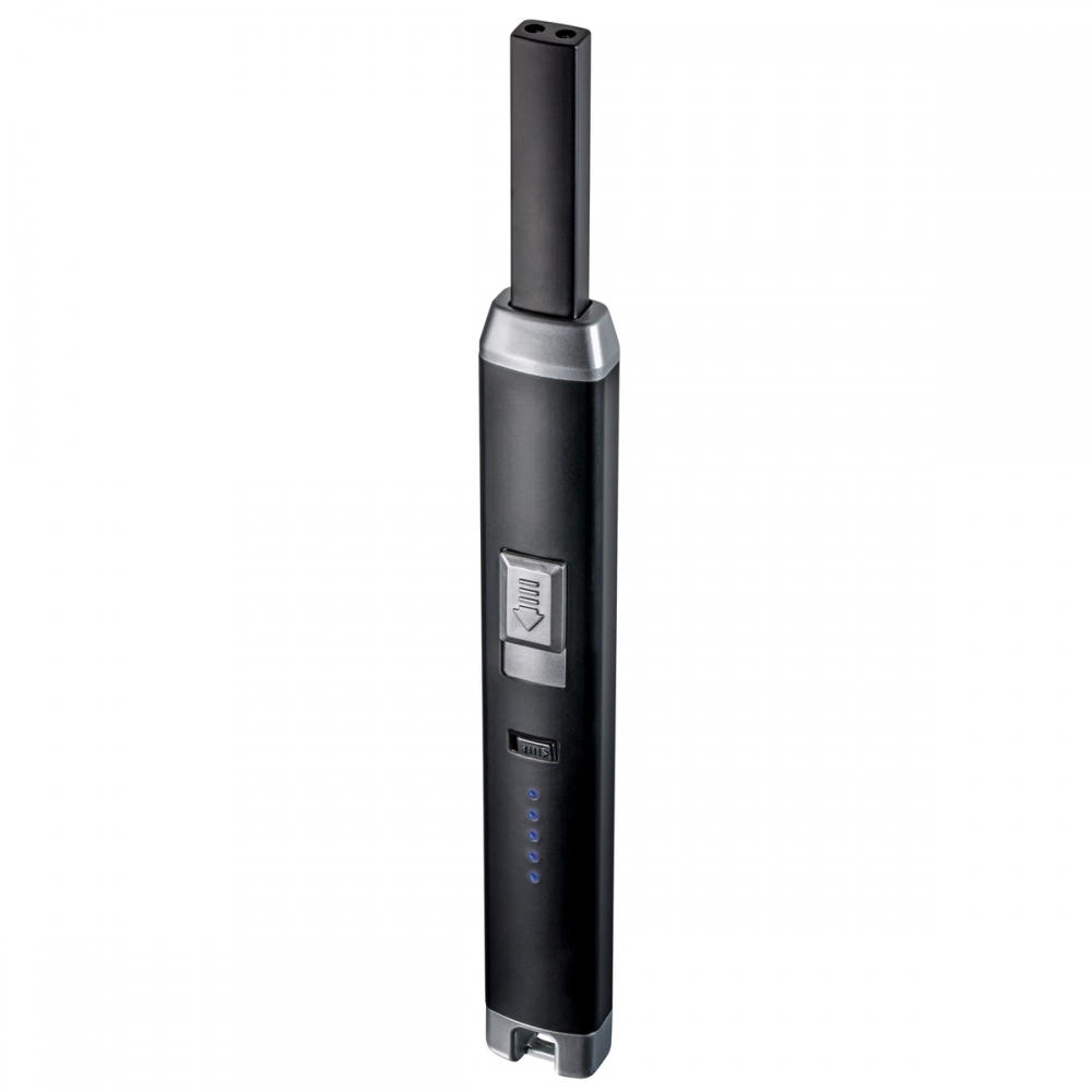Elegantes Lichtbogen-Stabfeuerzeug mit Aluminiumgehäuse und blau leuchtender LED- Ladestandanzeige. Der Lichtbogenkopf lässt sich im Korpus versenken und dient gleichzeitig als Kindersicherung. Ebenso verfügt das Feuerzeug über eine automatische Schutzabschaltung nach 7 Sekunden. Der Akku ist wieder aufladbar über USB-C.