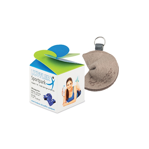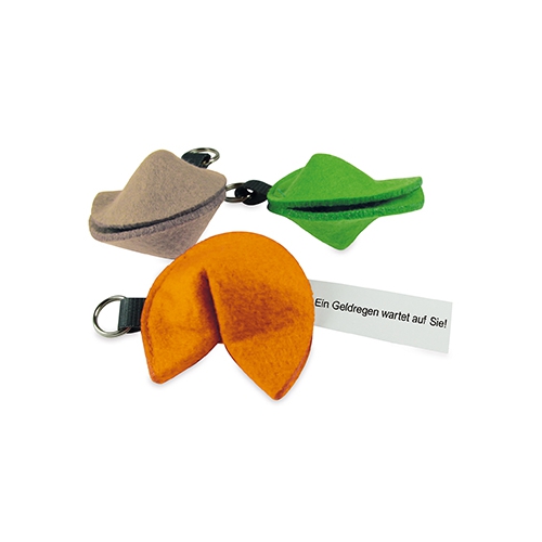 Artikel-Nr: 4011310071In den kleinen Filz-Schlüsselanhängern, in Form eines Glückskekses, können die Werbebotschaften eingelegt werden. Die Standardfarben sind braun, grün und orange (andere Filzfarben auf Anfrage möglich). Der Innenzettel kann individuell in schwarz mit Ihrer Botschaft bedruckt werden, ebenso die Einzelbox, die optional dazu erhältlich ist. Größe: 8 x 5,5 cm (inkl. Anhänger)