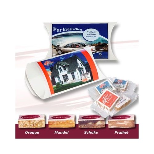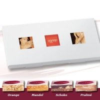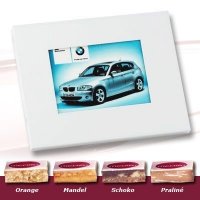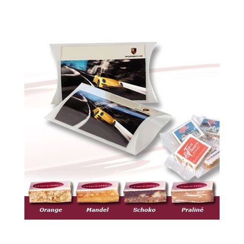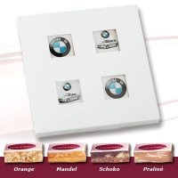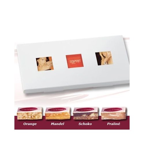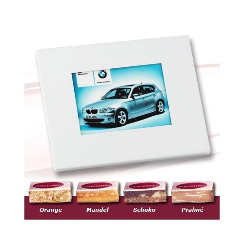 3 Logo-Florentiner-Pralinen Größe M im Karton. Begeisterte Kunden sind unser Ziel! Drei feine Florentiner-Plätzchen mit Lebensmittelfarben 4c nach Ihren Wünschen bedruckt, dekorativ in Szene gesetzt in einer Sichtfenster-Kartonage. Bis zu drei verschiedene Motive ohne Aufpreis. Besonders gut für Bildmarken oder Produktfotos geeignet. Überraschung, Staunen und Begeisterung sind Ihnen bei Ihren Adressaten sicher. Ob als Mailing-Begleiter, Produktsendungsbeilage oder persönlich übergebenes Präsent wirkungsvoller kann Ihre Werbebotschaft kaum transportiert werden. Logoaufdruck auf der Kartonage (Tampondruck) oder Anbringung von A ...