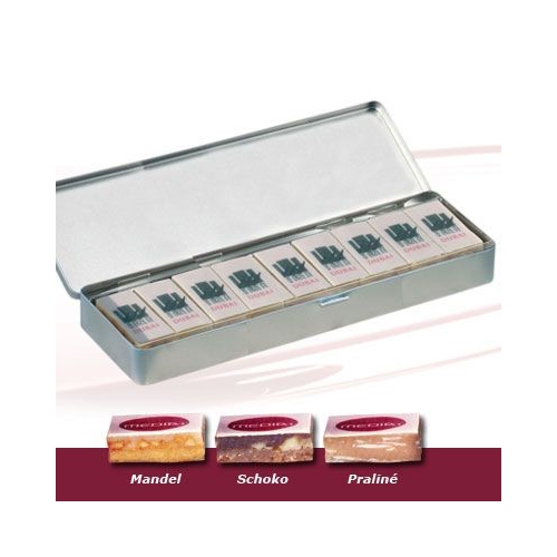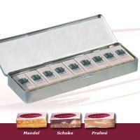 3 Logo-Florentiner Größe M in Metallbox. Begeisterte Kunden sind unser Ziel! Drei feine, mit Lebensmittelfarben 4c nach Ihren Wünschen bedruckte Florentiner-Plätzchen in hochwertiger Metallbox. Bis zu drei verschiedene Motive ohne Aufpreis. Besonders gut für Bildmarken oder Produktfotos geeignet. Überraschung, Staunen und Begeisterung sind Ihnen bei Ihren Adressaten sicher. Ob als Mailing-Begleiter, Produktsendungsbeilage oder persönlich übergebenes Präsent wirkungsvoller kann Ihre Werbebotschaft kaum transportiert werden. Logoaufdruck auf der Metallbox (Tampondruck) oder Anbringung von Aufklebern ist möglich. Bitte fragen Sie die Kosten ...
