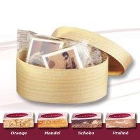 Feine Kekse mit Zimtgeschmack in einer runden Holzschachtel. Die Deckeloberseite kann von Ihnen individuell gestaltet werden. Inhalt: Zimtkekse 130 g Größe der Verpackung: Ø 155 mm, Höhe 45 mm Individualisierung: Digitaldruck