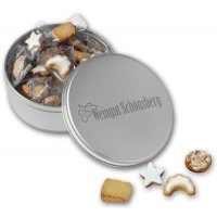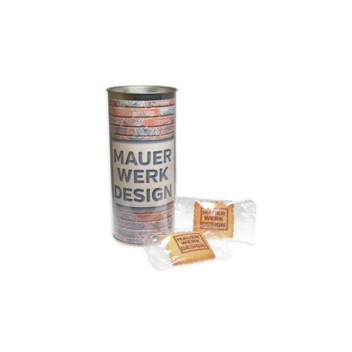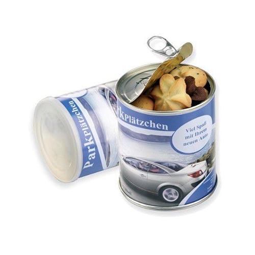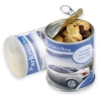 Origineller, effektiver und leckerer Werbeträger: dekorative Metalldose mit Zippverschluss, befüllt mit 14 köstlich schmeckenden Vanille-Butterkeksen. Diese können mit Ihrem Logo, Slogan und/oder Text bedruckt werden und sind aromageschützt einzeln in Folie eingeschweißt. Die Keks-Rundbox ist mit einer Papierbanderole versehen, die mit einer Druckfläche von 319 × 113 mm viel Raum auch für großformatige Aktionsslogans oder umfangreichere Werbebotschaften bietet. Er kann vierfarbig bedruckt und nach eigenen Wünschen und Vorstellungen gestaltet werden und macht die Dose so zu einem wahren Eyecatcher. Mit den 14 Butterkeksen Inhalt is ...