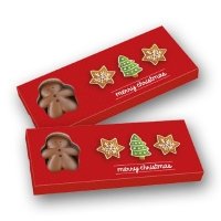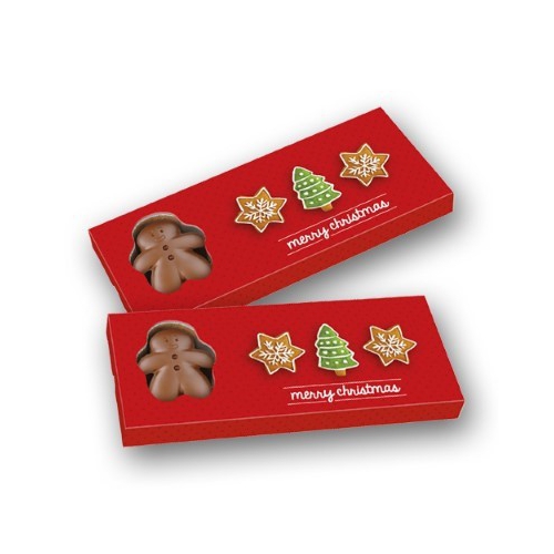 Feine Schokolade in Keksmännchen Form. Gestalten Sie die Sichtfensterverpackung ganz nach Ihren Wünschen. Inhalt: 4 Schokofiguren (gesamt 65 g) Geschmacksrichtung: Vollmilchschokolade Größe der Verpackung: 232 x 98 x 20 mm Individualisierung: Offsetdruck, Digitaldruck
