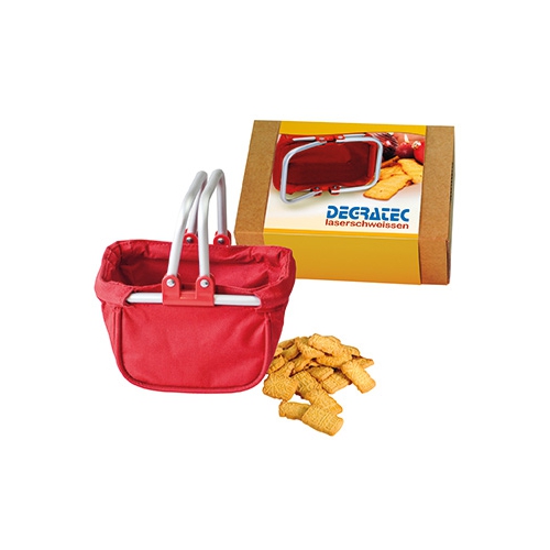 Dieses rote kleine Körbchen beinhaltet Butter-Spekulatius zum Genießen. Klein und praktisch, dient er als Aufbewahrungskorb vieler gesammelter Utensilien. Einsatzmöglichkeiten: alles für den Schreibtisch, Notizen oder Badeutensilien und Werkzeug, Taschenlampe, Flaschenöffner, Streichhölzer. Es gibt viele Dinge, die schnell ein Behältnis suchen. Zusammengefaltet im Präsentkarton überreicht, macht dieser pfiffige Korb Freude. Werbeeindruck auf dem Standardmotiv der umlaufenden Banderole oder eine eigene Gestaltung, jeweils ab 250 Stück. Ein Tampondruck direkt auf dem Korb ist ab 100 Stück möglich. Zutaten: WEIZENMEHL, ...