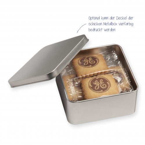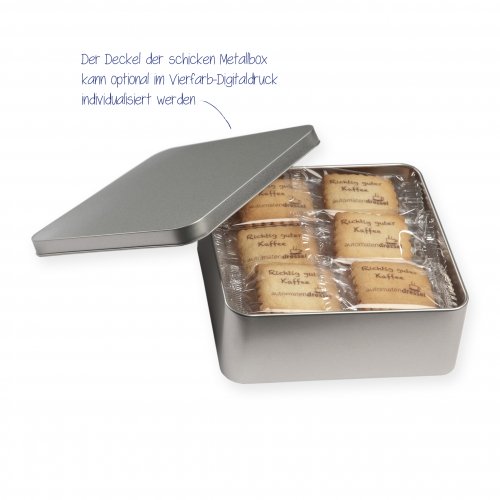 Dieses Präsent erhält besonders viel Aufmerksamkeit - ob als Präsent beim Kundenbesuch, als Messe-Giveaway oder individualisiertes Geschenk bei Ihrem Kundenevent. 12 Vanille-Butterkekse werden mit Ihrem Wunschmotiv 1-farbig bedruckt sorgen so dafür, dass Ihre Botschaft in aller Munde ist. Die schicke Box wird zusätzlich mit einer eingesteckten Papierbanderole zu einem optischen Highlight auf jedem Messestand. Die Banderole bietet besonders viel Platz für Ihre Botschaften. Durch den Metallboden und Deckel wirkt die Box besonders wertig.