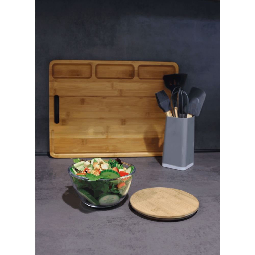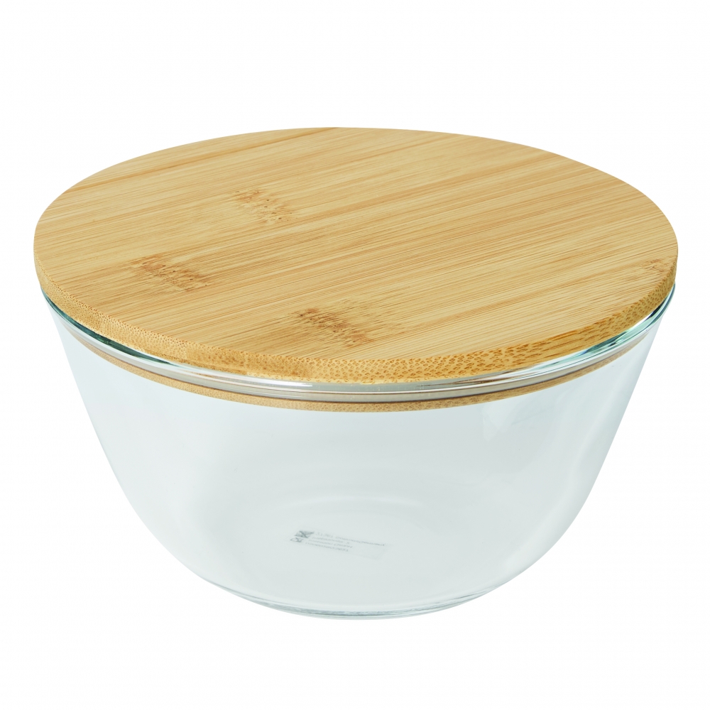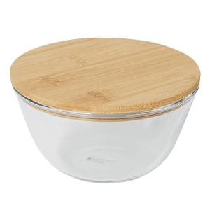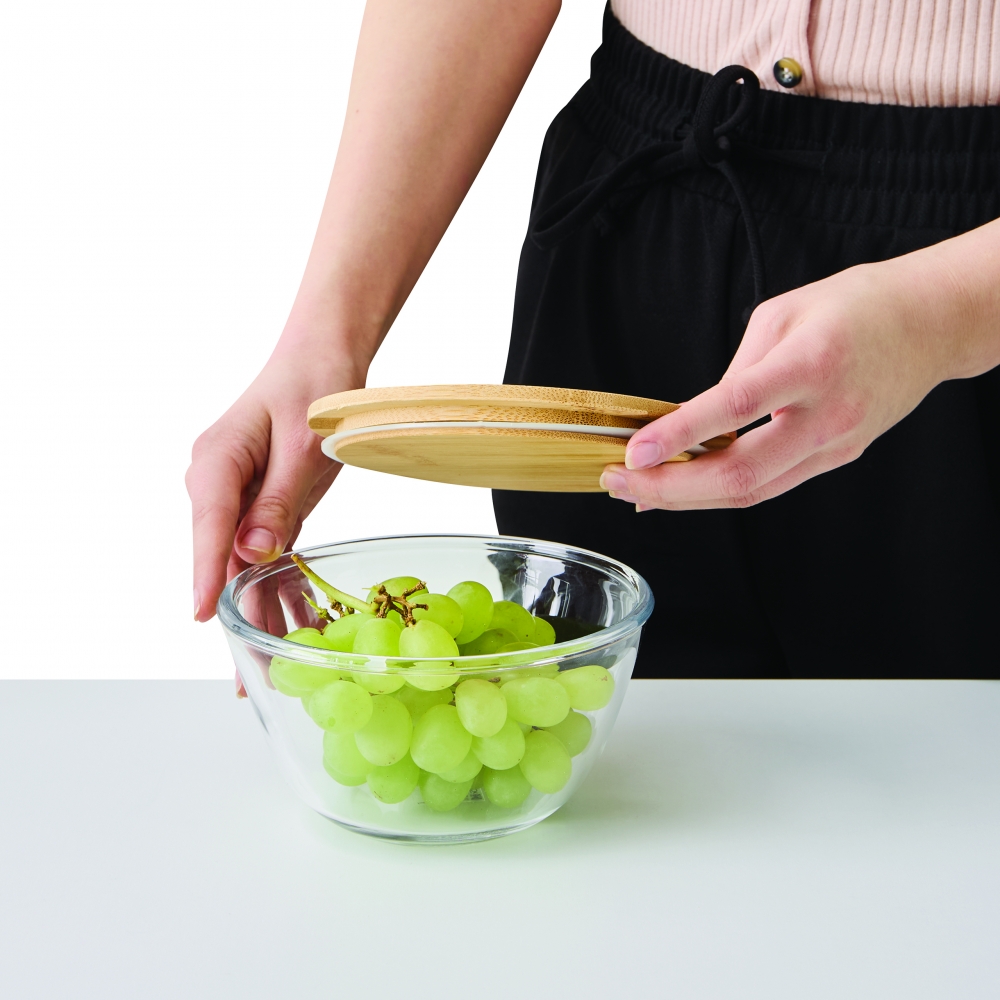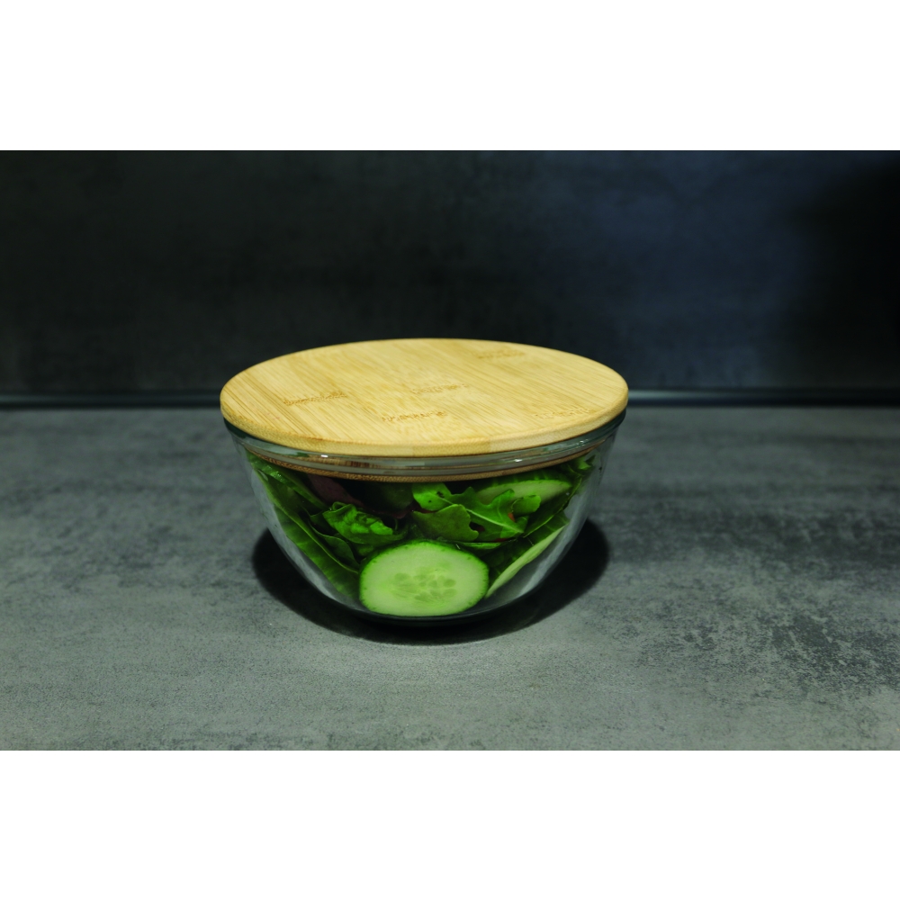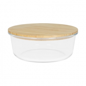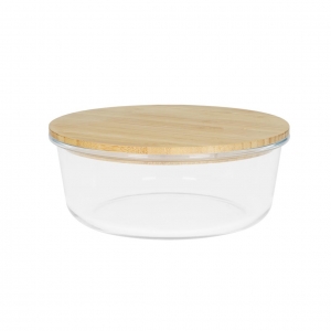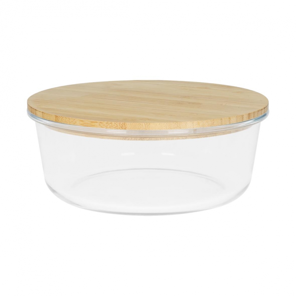 Schöne runde Box mit einer Schale aus hochwertigem und hitzebeständigem Borosilikat-Glas. Der Deckel aus Bambus verfügt über einen Silikonring und hält somit besonders gut auf der Schale. Die Glasschale ist für die Verwendung in der Mikrowelle geeignet.