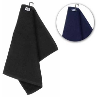 Golf-Handtuch mit den Maßen 40 x 50 cm aus weicher, saugfähiger Baumwolle von hoher Qualität (650 g / m2). Mit Edelstahl-Öse und Befestigungskarabiner.