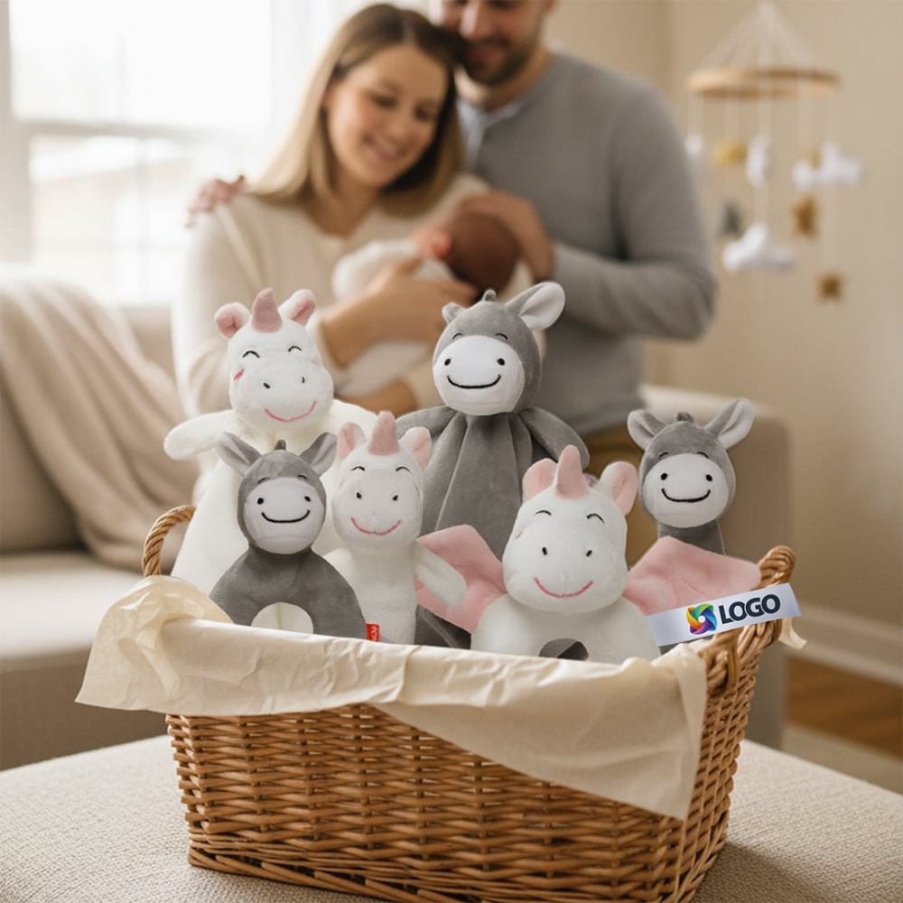 Der klassische Esel-Greifling überzeugt durch seine greiffreundliche Form, flauschige Materialien und kindgerechte Farben. Er weckt Neugier und begleitet die Kleinsten sicher beim Erkunden ihrer Welt. Mit Werbefahne versehen, lässt sich Ihre Werbebotschaft ansprechend und emotional transportieren. Selbstverständlich ist der Greifling zertifiziert gemäß OEKO-TEX® STANDARD 100 (A08-0261 Hohenstein HTTI, oeko-tex. com / standard100). Alle Bestandteile wurden auf Schadstoffe geprüft und sind besonders geeignet für die empfindliche Babyhaut.
