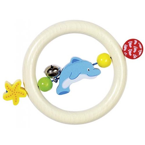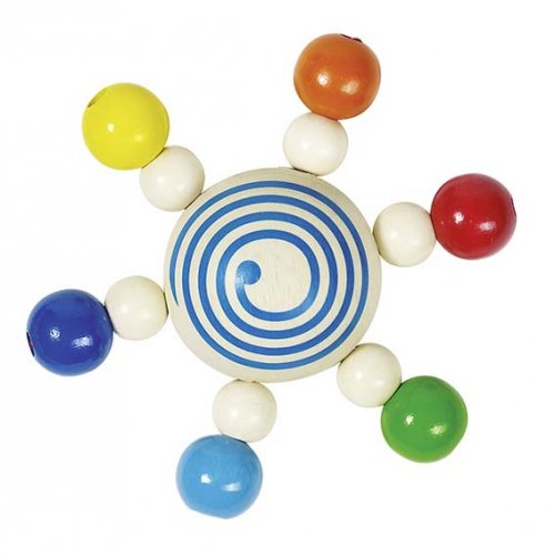 Mit einem Glöckchen. Den Greifling kann man verbiegen. Die Holzperlen massieren dabei die Handflächen. Achtung! Nicht geeignet für Kinder unter 36 Monaten.