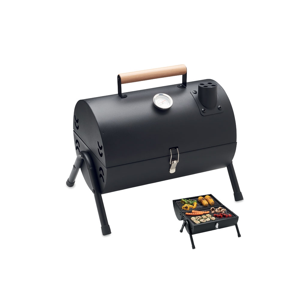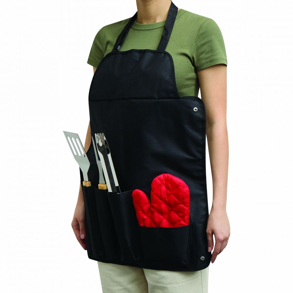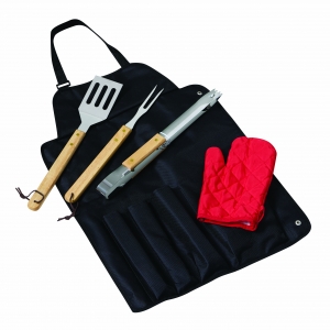 Artikel-Nr: KTO133820000007-teiliges Grill-Set mit Wender, Fleischgabel und Zange aus Edelstahl mit Holzgriff sowie gepolsterten Handschuhen und Salz- und Pfefferstreuer. Präsentiert in einem robusten 600D Polyester-Etui in Schwarz mit Metallknopfverschluss. Mit verstellbarem Tragegurt aus robustem Nylon mit Klickverschluss.