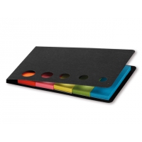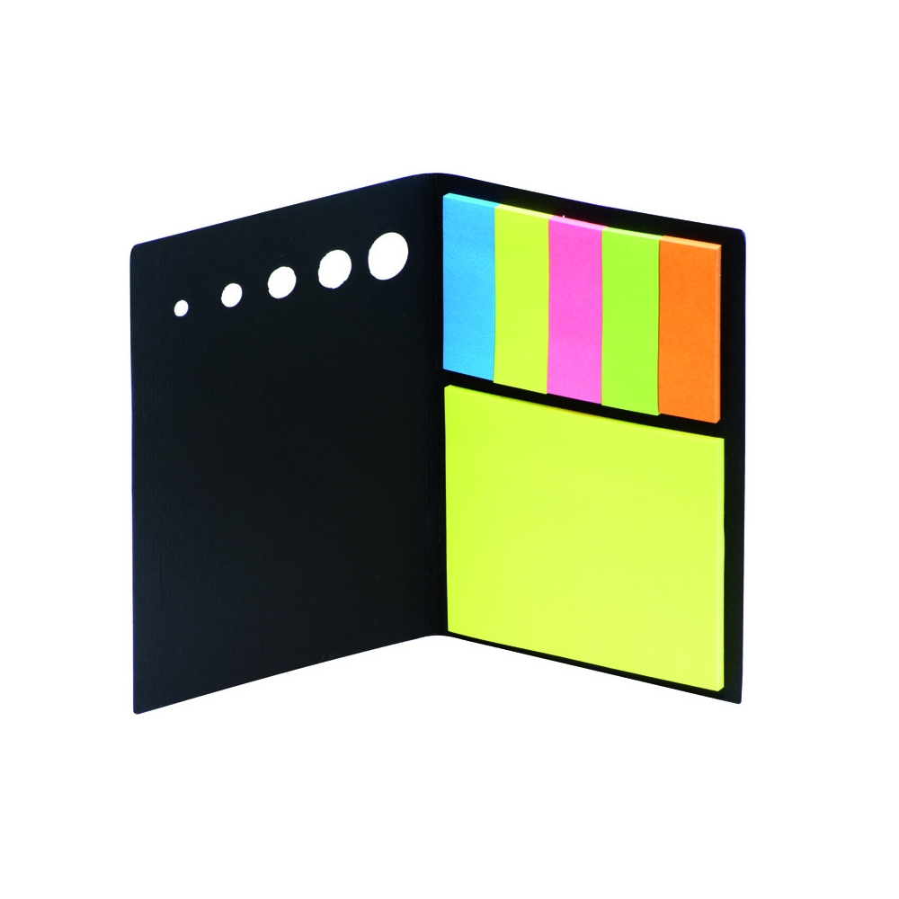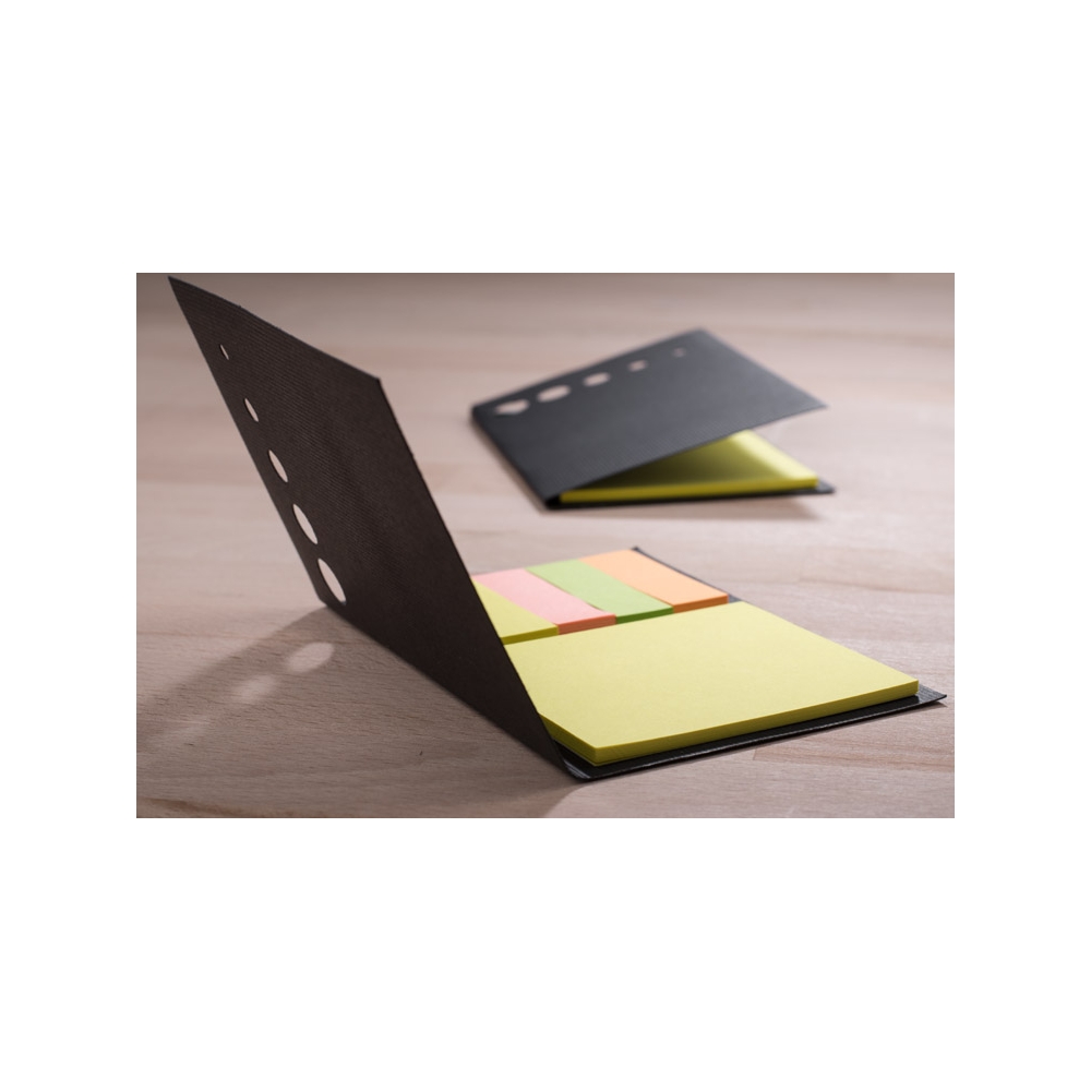 Haftnotizen in 5 Farben und Taschennotizbuch mit schwarzem Umschlag. Das Logo wird mit der Tampondruck-Metode aufgetragen.