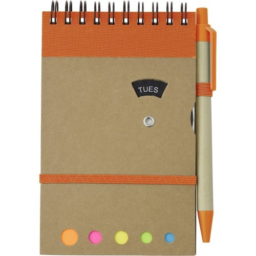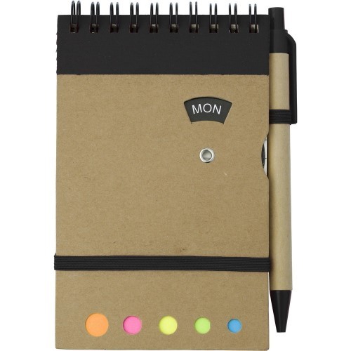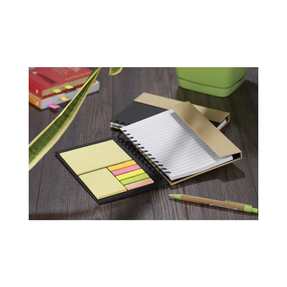 Notizbuch mit Cover aus recyceltem Karton. 100 Blatt Blankopapier, 2 unterschiedlich große, gelbe Haftnotizblöcke und 5 farbige Markerblöcke. Mit passendem Druckkugelschreiber mit Papierschaft. Stifthalter. Elastisches Verschlussband. FSC®-certified | FSC MIX, P7.1, FSC-C213206