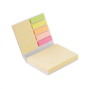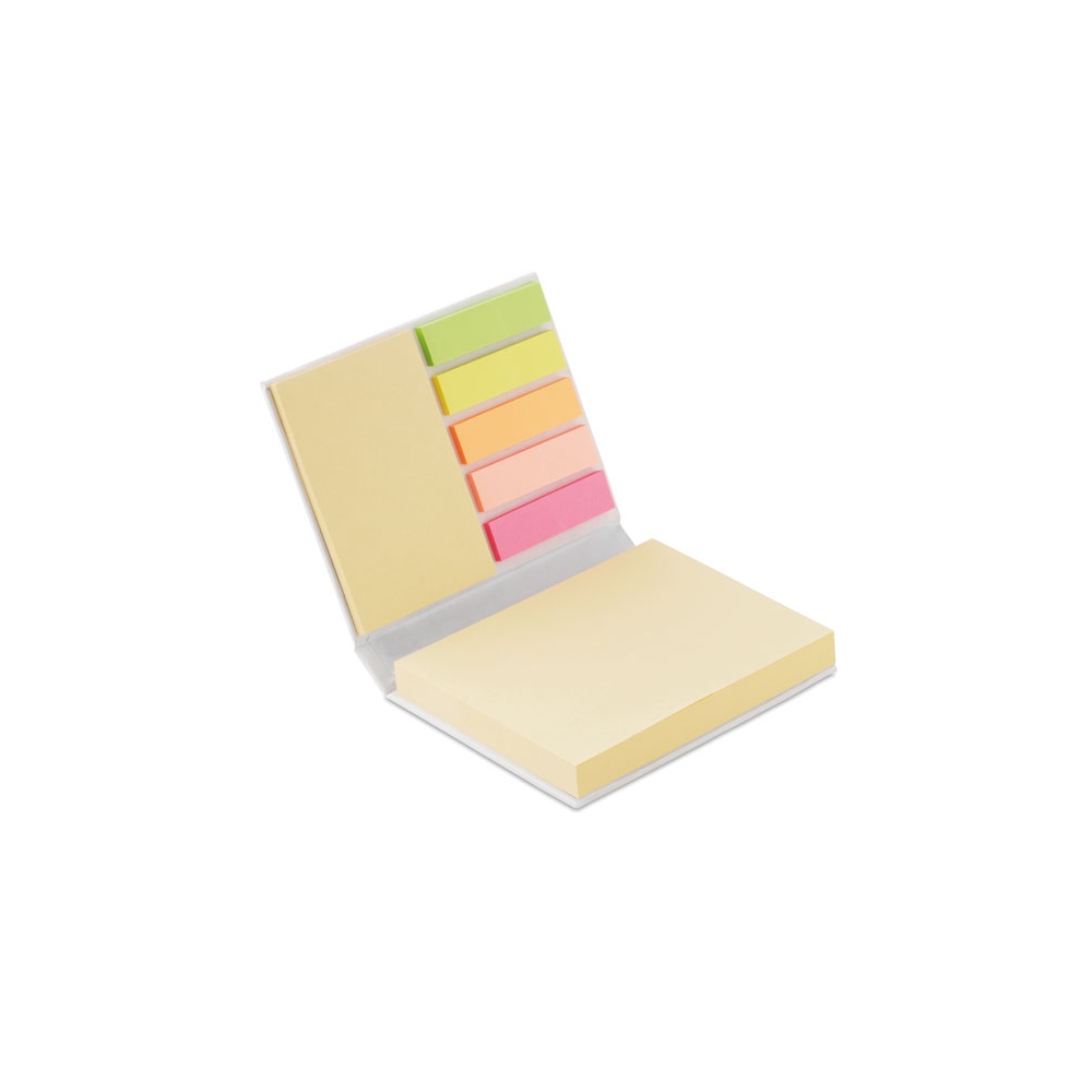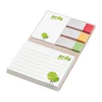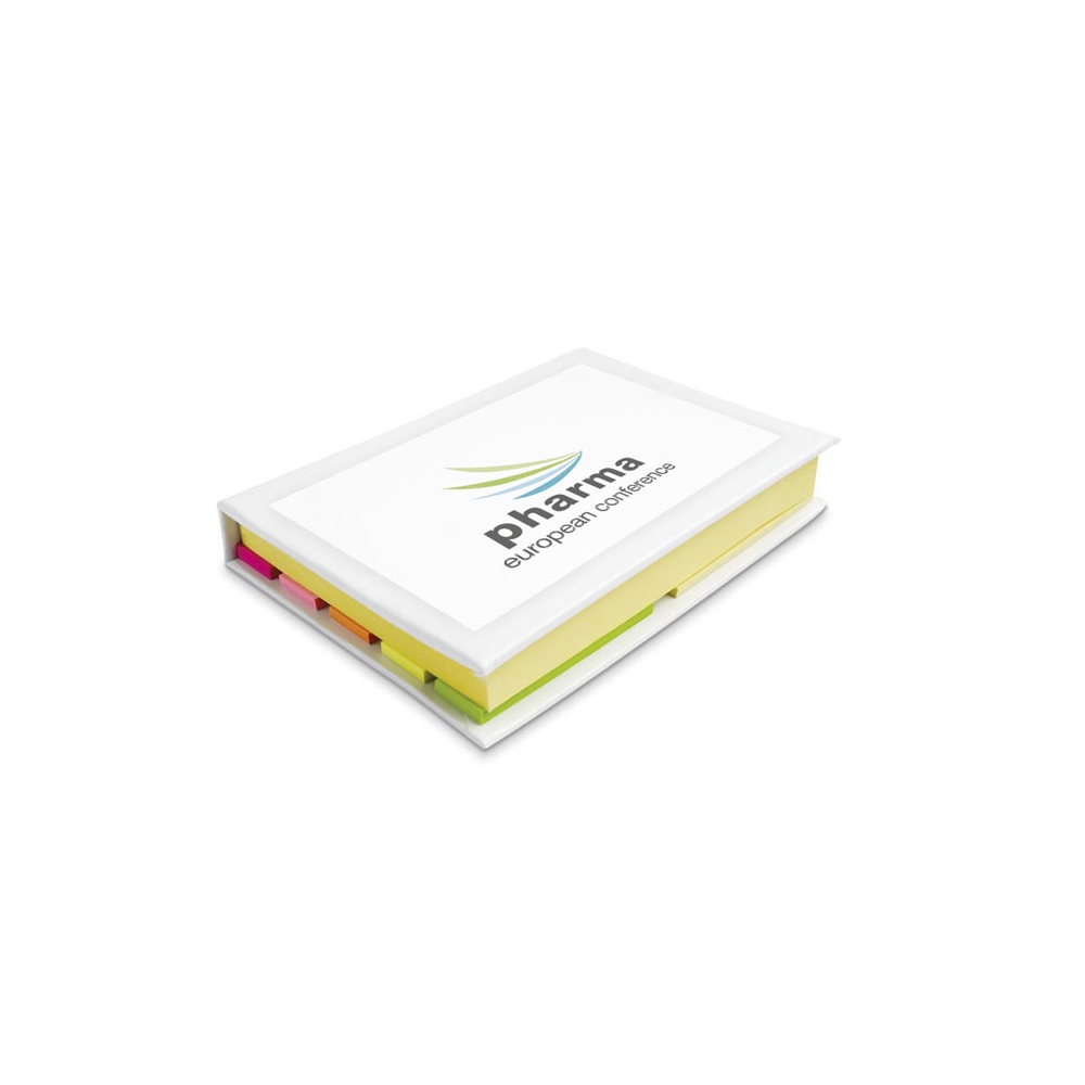 Individueller, mit Papier überzogener Haftnotizblock. Enthält 50 Blatt Haftnotizen aus Recyclingpapier (75 x 75 mm) und 100 Seitenmarkierungen aus Kunststofffolie in 5 verschiedenen Farben (44 x 12 mm). Der Preis beinhaltet eine vollfarbig bedruckte Außenhülle. Mindestbestellmenge: 100 Stk.