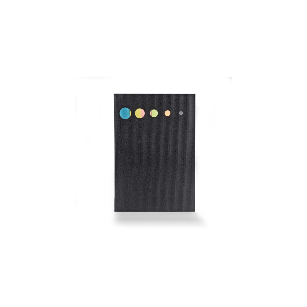 DIN A5 Notizbuch mit Cover aus Karton. 80 Blatt (160 Seiten) Recyclingpapier, 25 Blatt Haftnotizen und 5 Markerblöcke. Elastisches Verschlussband und Stiftschlaufe.