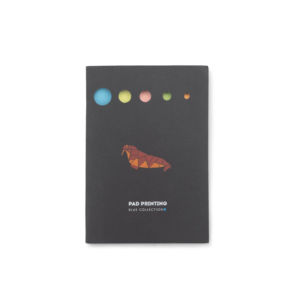 Notizbuch mit 70 Seiten und blau schreibendem Kugelschreiber. Zum Markieren sind weitere 25 große und kleine Haftnotizen, sowie jeweils 25 farbige Haftmarker enthalten. Ihre Werbung drucken wir auf das Cover.