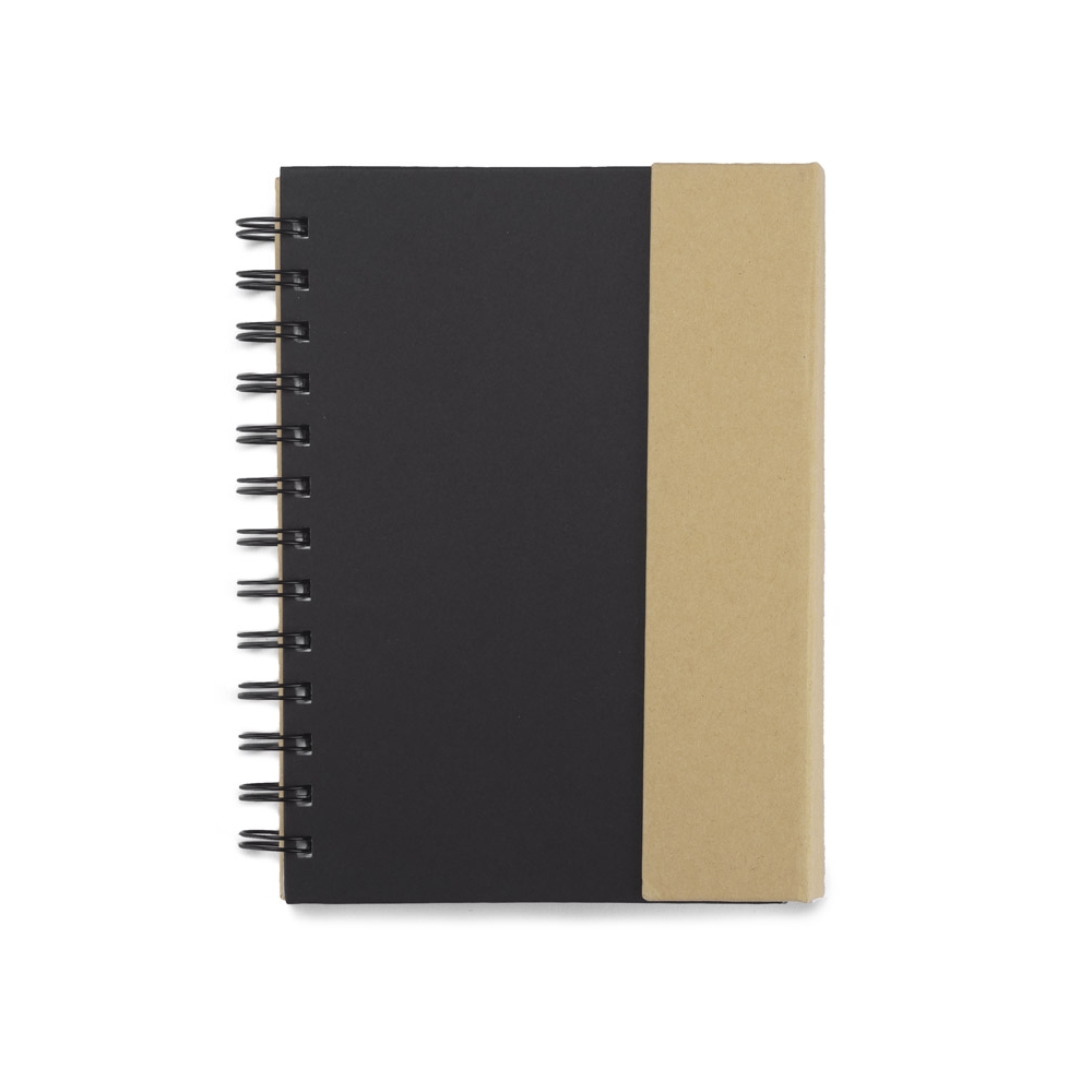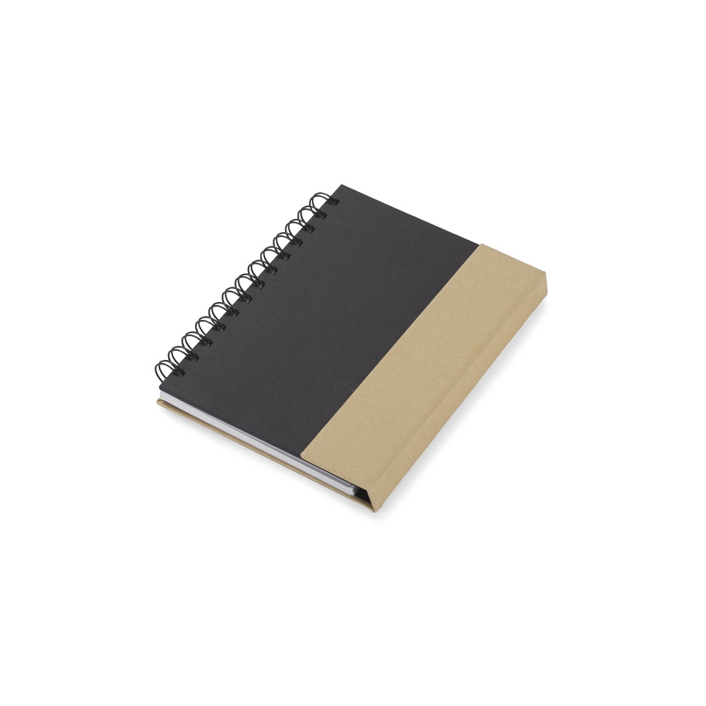 Spiralnotizbuch mit Magnetverschluss. 70 Blatt schwarz-liniert. Haftnotizen 25 Blatt. Inklusive Kugelschreiber. Das Logo wird mit der Tampondruckmethode.