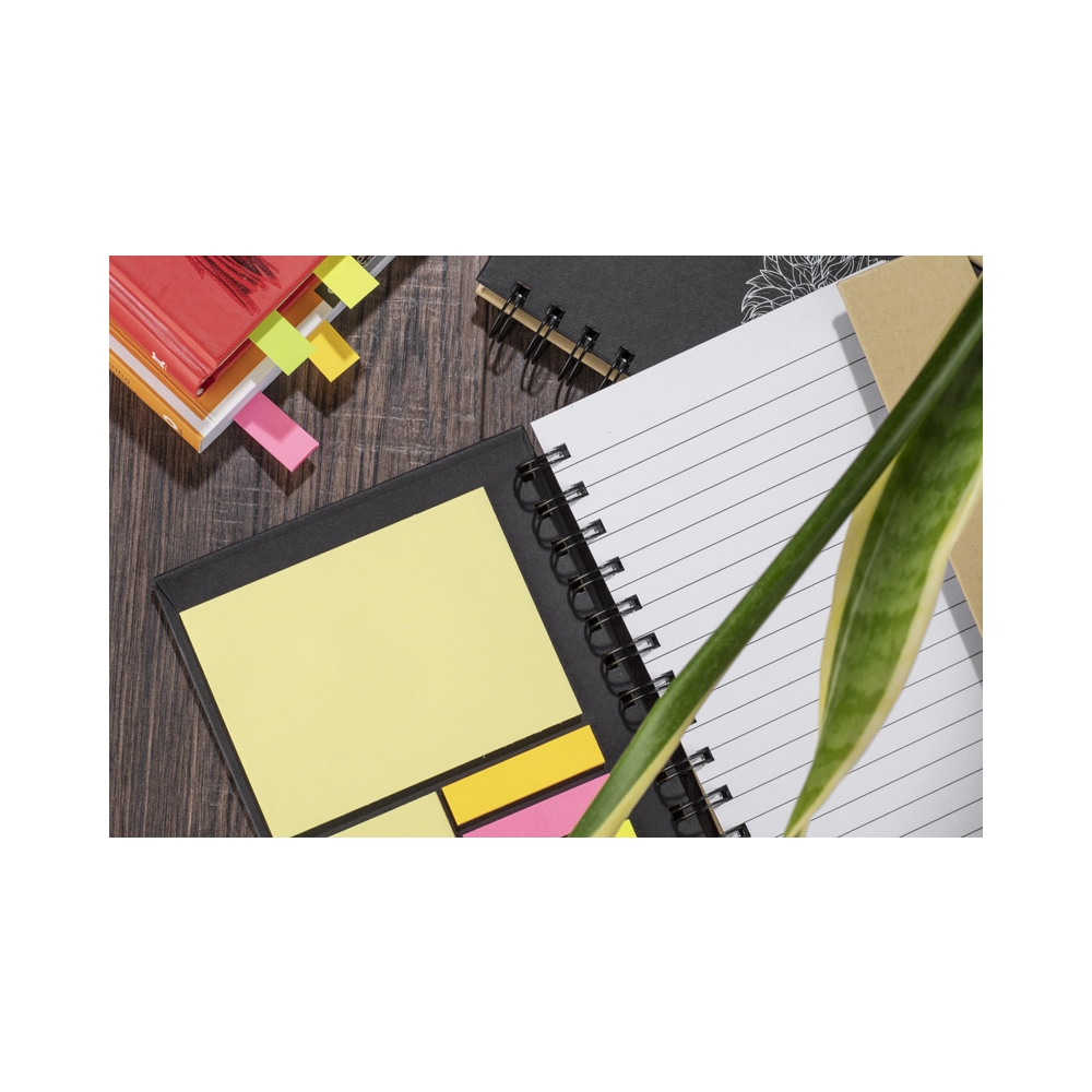 Notizbuch mit Ringbindung mit 5 x großen und 5 x kleinen Haftnotizen in unterschiedlichen Neonfarben (20 Stk. pro Farbe).