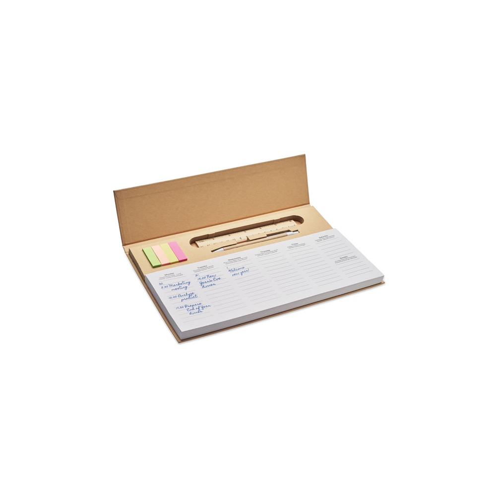 125-seitiger Wochenplaner in 6 Sprachen (EN / DE / FR / ES / IT / NL / PL). Umschlag aus Kraftpapier, Druckkugelschreiber aus Karton mit blauer Tinte, Lineal aus Holz und Haftnotizen.