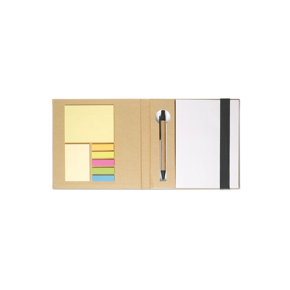 Artikel-Nr: KTO21885006000Notizblock mit Haftnotizen aus recyceltem Karton. Mit stabilen Cover und 80 glatten Blättern. Im Innencover des Covers enthalten: 25 gelbe Haftnotizen, 125 Mini-Haftnotizen in verschiedenen Farben und eine praktische Krafthülle. Mit Halter für Stifte und passendem Gummiband. Recycelter Karton stammt aus der Wiederverwertung von überschüssigen Produktionen und dem Recycling von Papier am Ende seiner Lebensdauer und wird zu einer ökologischen und nachhaltigen Leinwand.