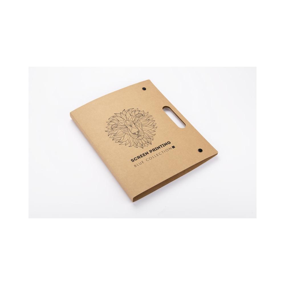 Schreibmappe 'Poet' aus Karton mit 20 Blättern (ca. DIN A4 Format), Stift-Schlaufe, sowie Haftnotizen in vier Farben mit jeweils 25 Stk. pro Farbe. In die Mappe ist ein Griff gestanzt.
