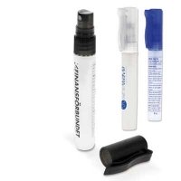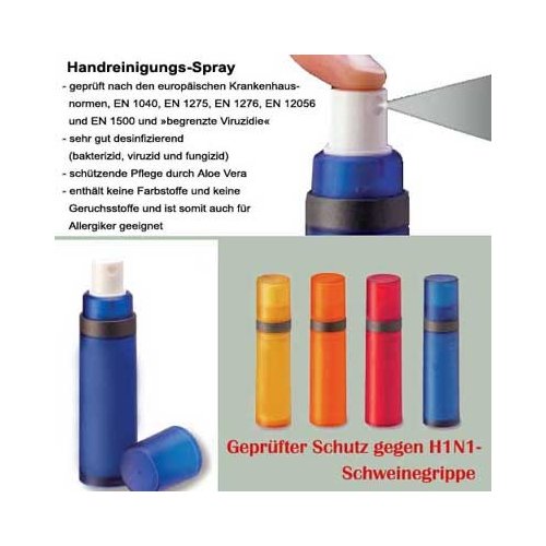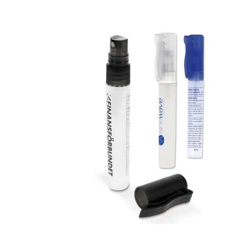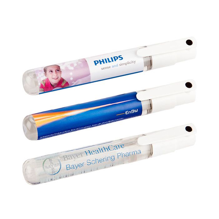 Handreinigungspray auf Basis von Alkohol. Mit den Pflegestoffen Aloe Vera und Vitamin E. Hervorragend für die Handtasche. Maße: 18 x 125 mm. Farbe/n: Transparent, Transparent Blau, Transparent Schwarz. Werbeanbringung: 40 x 10 mm.
