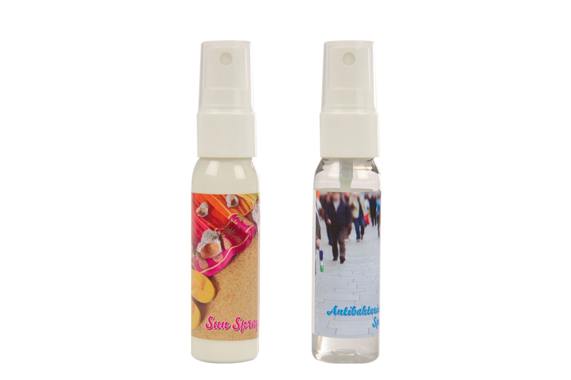 Flaschen in weiß, Deckel transparent Digital-Etikett mit Schutzlaminat:Handlotion: zur täglichen Intensivpflege der normalen und speziell der trockenen Haut, besonders nach dem Duschen, Baden, Sonnenbaden. Enthält reichhaltige Pflegesubstanzen und die wertvollen Wirkstoffe der Aloe Vera, Avocadoöl, Hydroviton®, Gurkenextrakt, Kamillenextrakt. Handreinigungsspray/Handdesinfektionsspray: Für die Reinigung der Hände ohne Wasser, Seife und Handtuch. Ideal für den Urlaub, zu Hause und unterwegs. Wirkt antibakteriell.