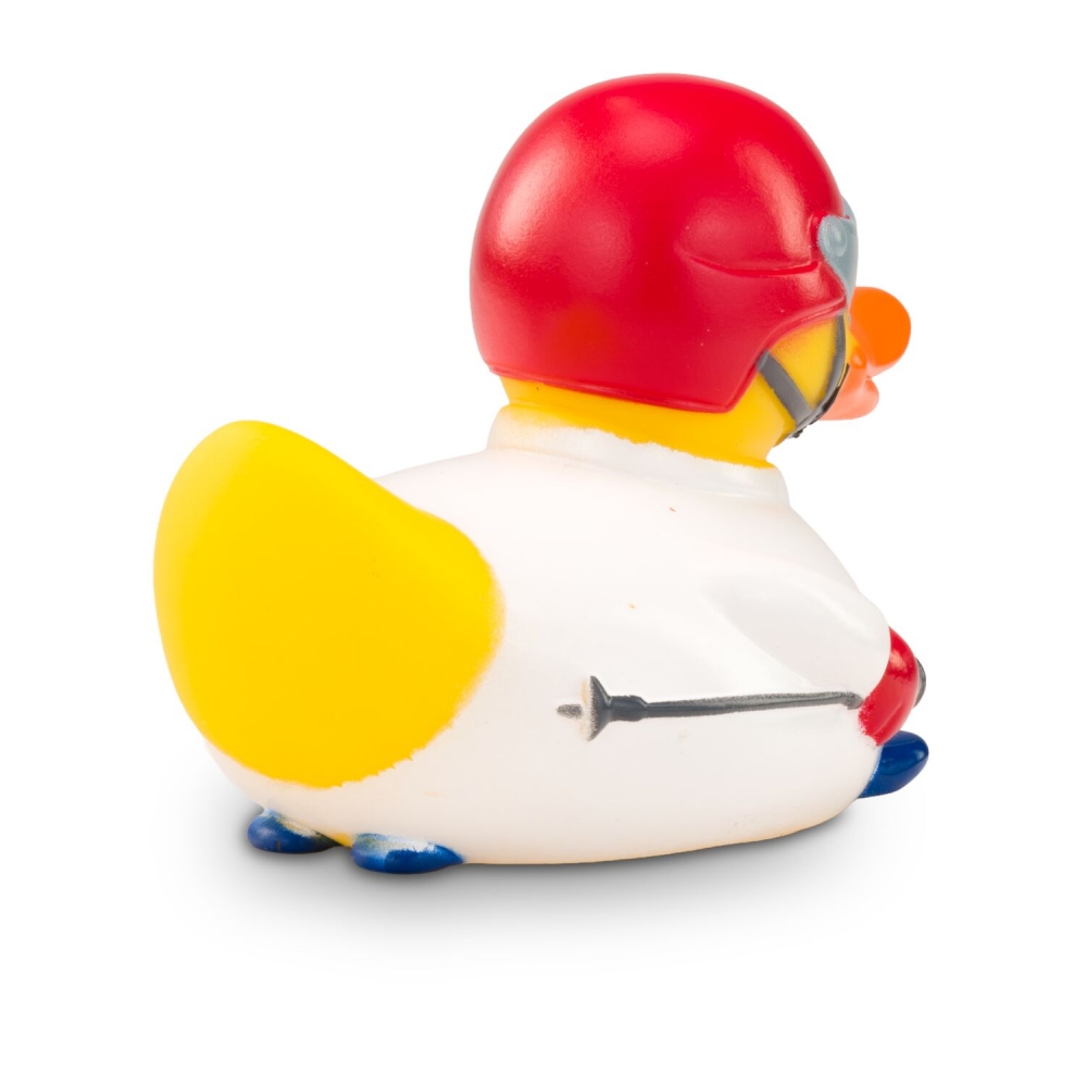 Andi Abfahrt ist leidenschaftlicher Ski-Abfahrtsläufer. Er rast den Hang hinunter wie ein Weltmeister. Gottseidank schützen ihn ein weißer Skianzug, ein roter Helm mit Visier und rote Handschuhe. Seine Skistöcke hat er fest im Griff. Größe: ca. 8 cm. Inklusive Quietschventil