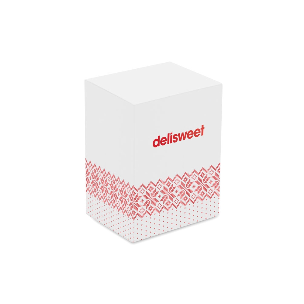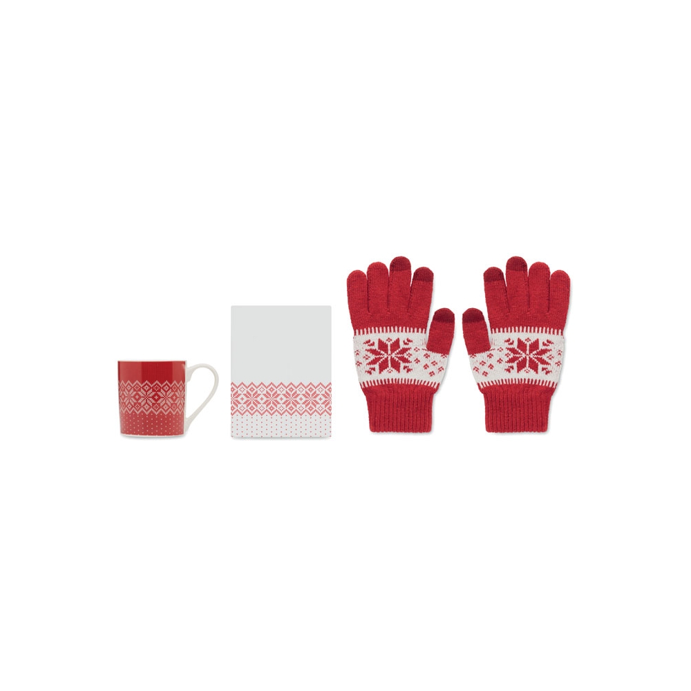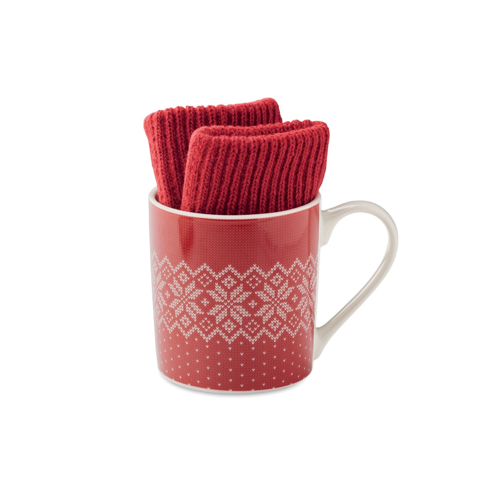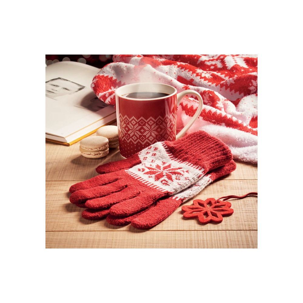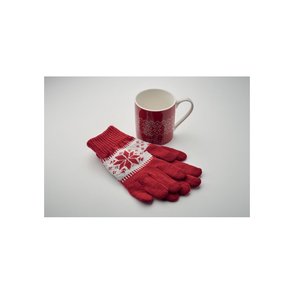 Winterliches Geschenkset, bestehend aus einem Paar gestrickter, taktiler Handschuhe und Keramikbecher. Schneeflockenmuster. Füllmenge: 300 ml. Lieferung in passender Schachtel.