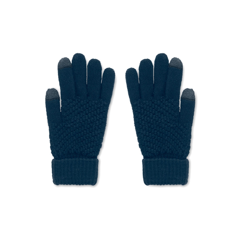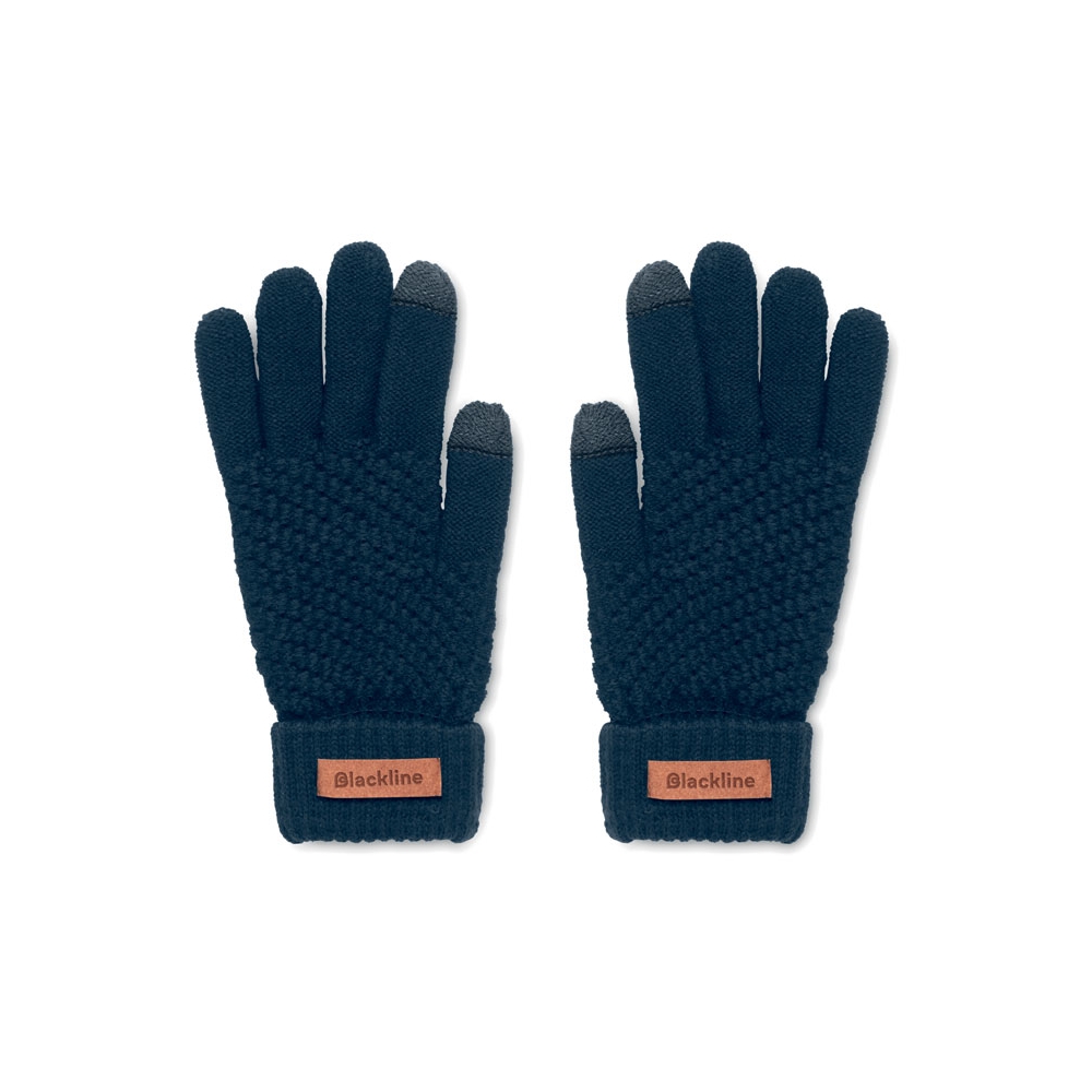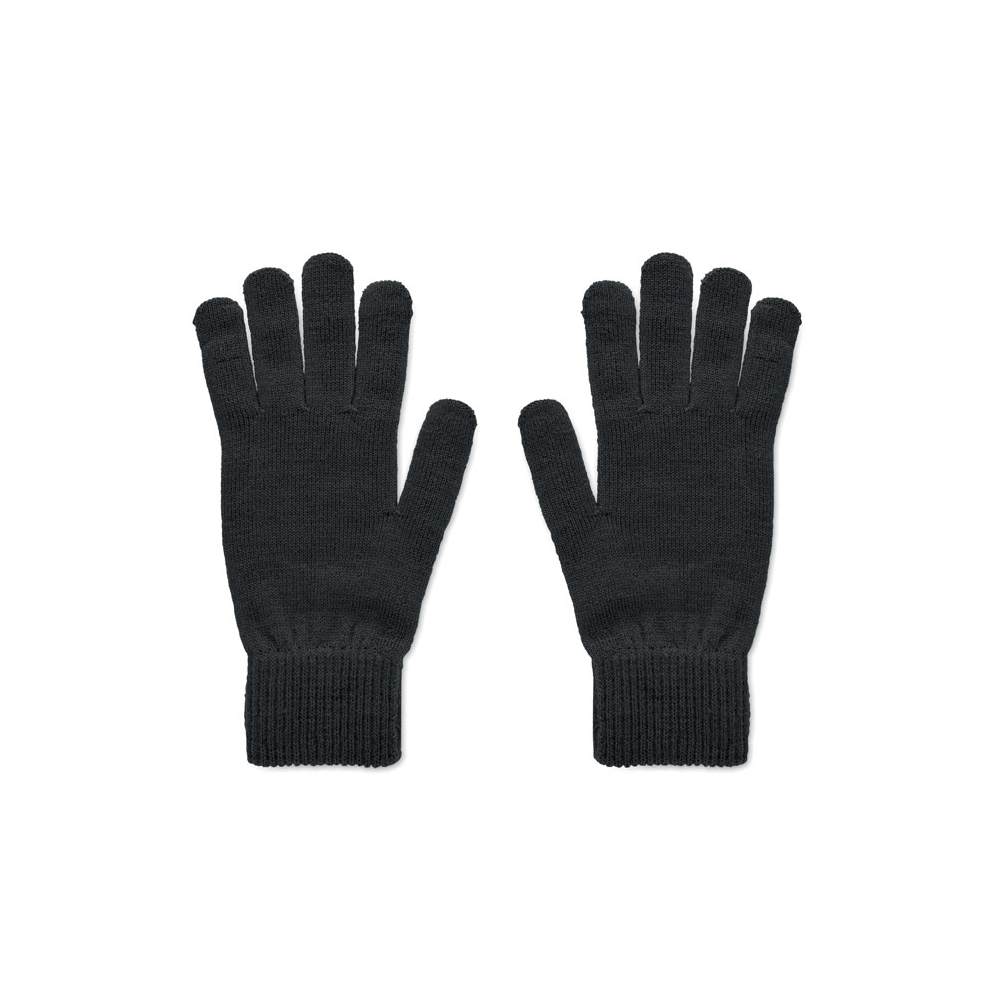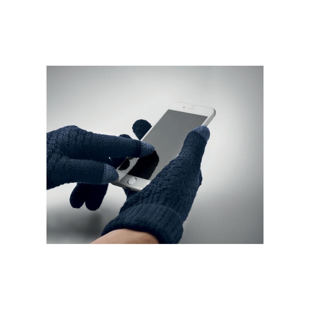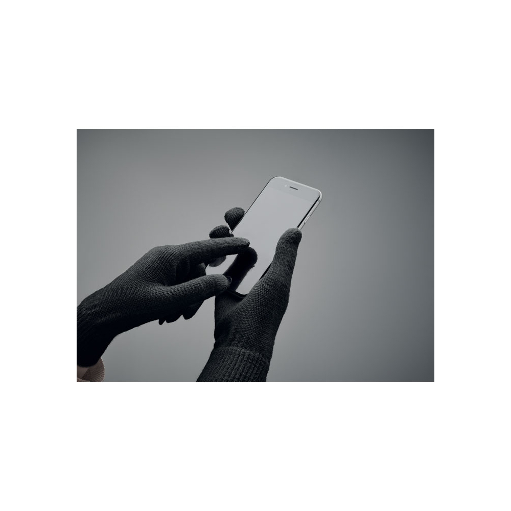 Handschuhe aus RPET und weichem Acryl mit speziell gefertigten Spitzen an Daumen, Zeige- und Mittelfinger, welche die Bedienung von Smartphones ermöglichen ohne die Handschuhe auszuziehen, ein ideales Wintergadget. Ihre Werbung wird auf den Handrücken gedruckt.