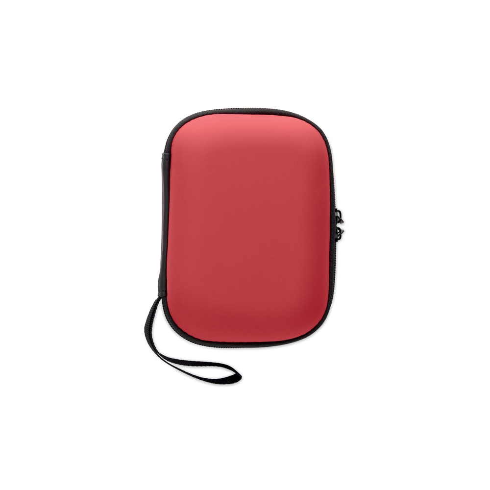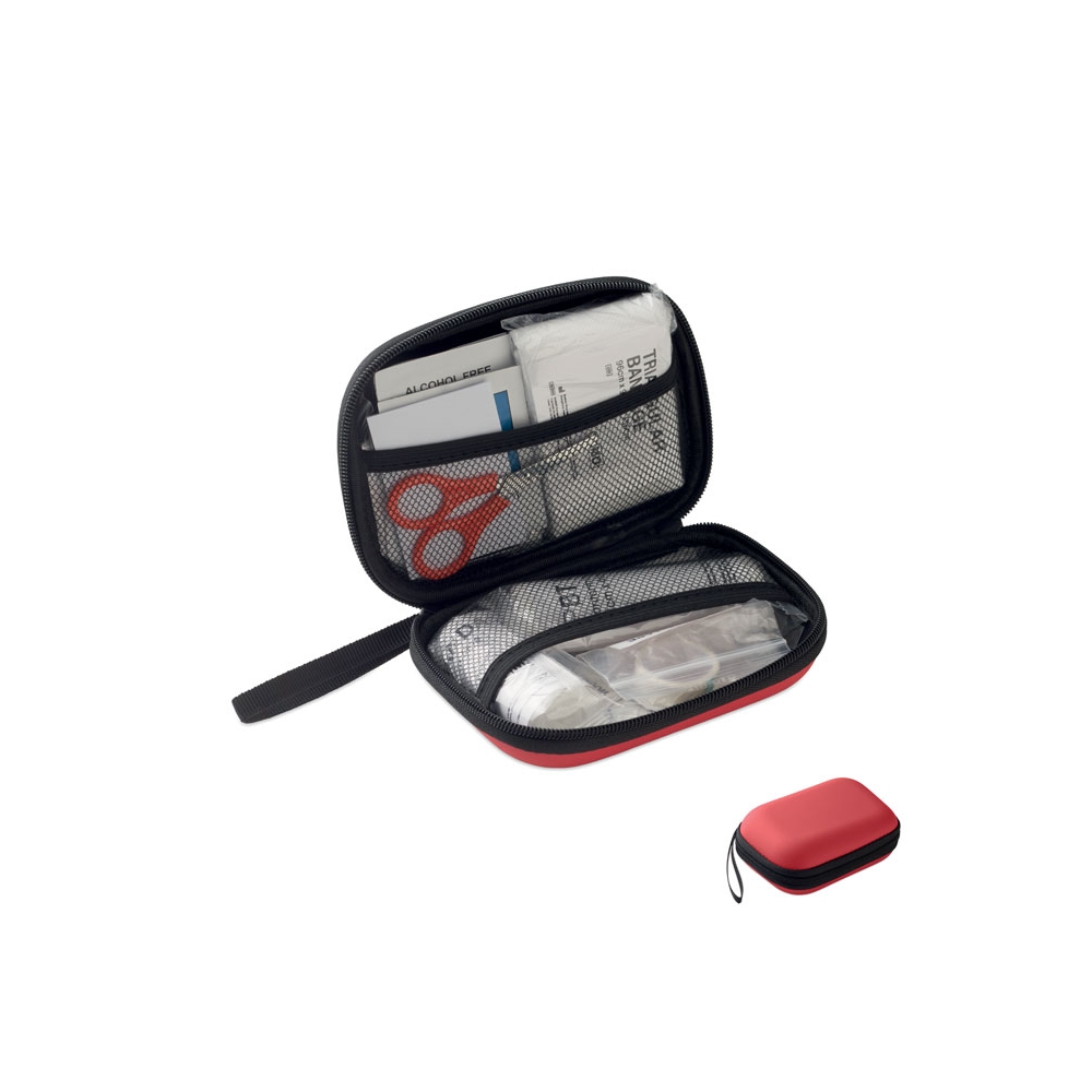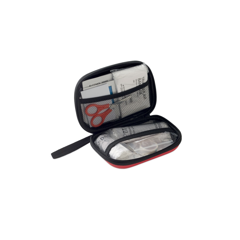 Erste-Hilfe-Set in roter Nylontasche mit folgendem Inhalt: 1x Einmal Eisbeutel, 2 x Dreiecksbinden, 1x Erste Hilfe Ratgeber, 1x Mull-Kompresse 5x5 cm, 4x Mull-Kompresse 7,6x7,6 cm, 2x Paar Handschuhe aus PVC, 1x PBT Mullbinde 6x400 cm, 1x PBT Mullbinde 8x400 cm, 1x Pflasterrolle 2,5x500 cm, 1x Beatmungstuch mit Mundstück, 1 x Rettungsdecke, 1x Schere, 1x Pinzette aus Kunststoff, 10x Alkoholtupfer, 5x feuchte Reinigungstücher, 2x Gewebepflaster, 2x Tape Verband 4x6,5 cm, 2x viereckige Pflaster, 20x Pflaster 7,2x1,9 cm, 1 x Stirn- Thermometer.