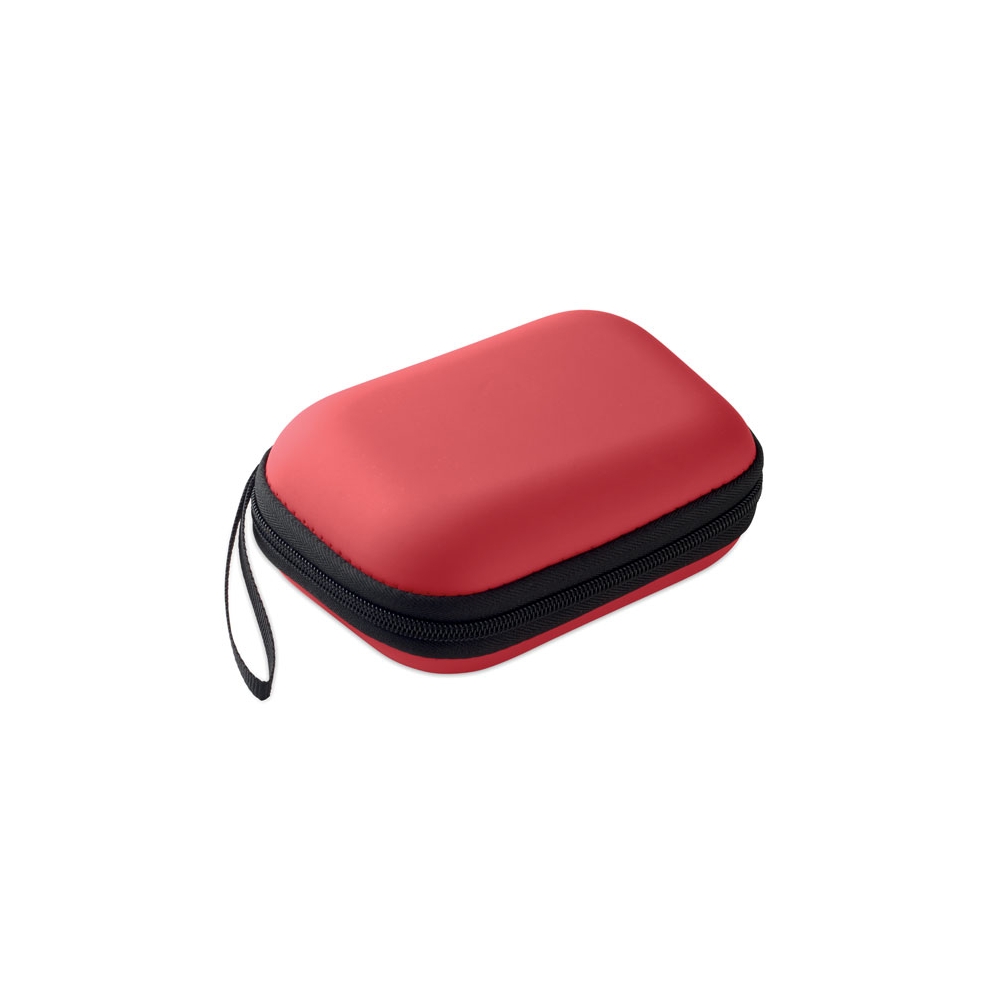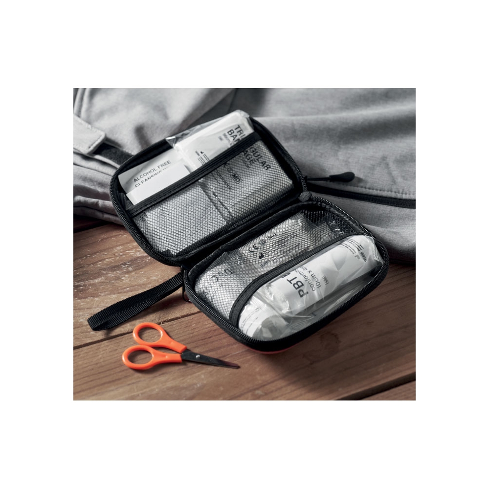 Ein vollständiges und platzsparendes Set um leichte Verletzungen zu versorgen. Tasche aus rotem Nylon 600D mit folgendem Inhalt: Schere, Latexhandschuhe, Heftpflaster, 4 Kompressen, 10 Wattestäbchen, 10 Pflaster, 5 Rollen Mullbinden (5 cm), 6 sterile Kompressen (5 x 5 cm), 4 antiseptische Tücher. Größe: ca. 18,5 x 12,5 x 2,5 cm. Gewicht: ca. 130 g.