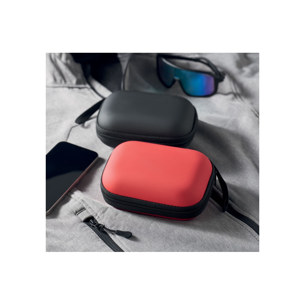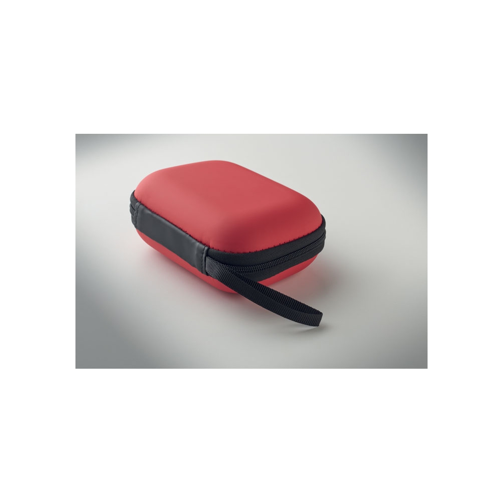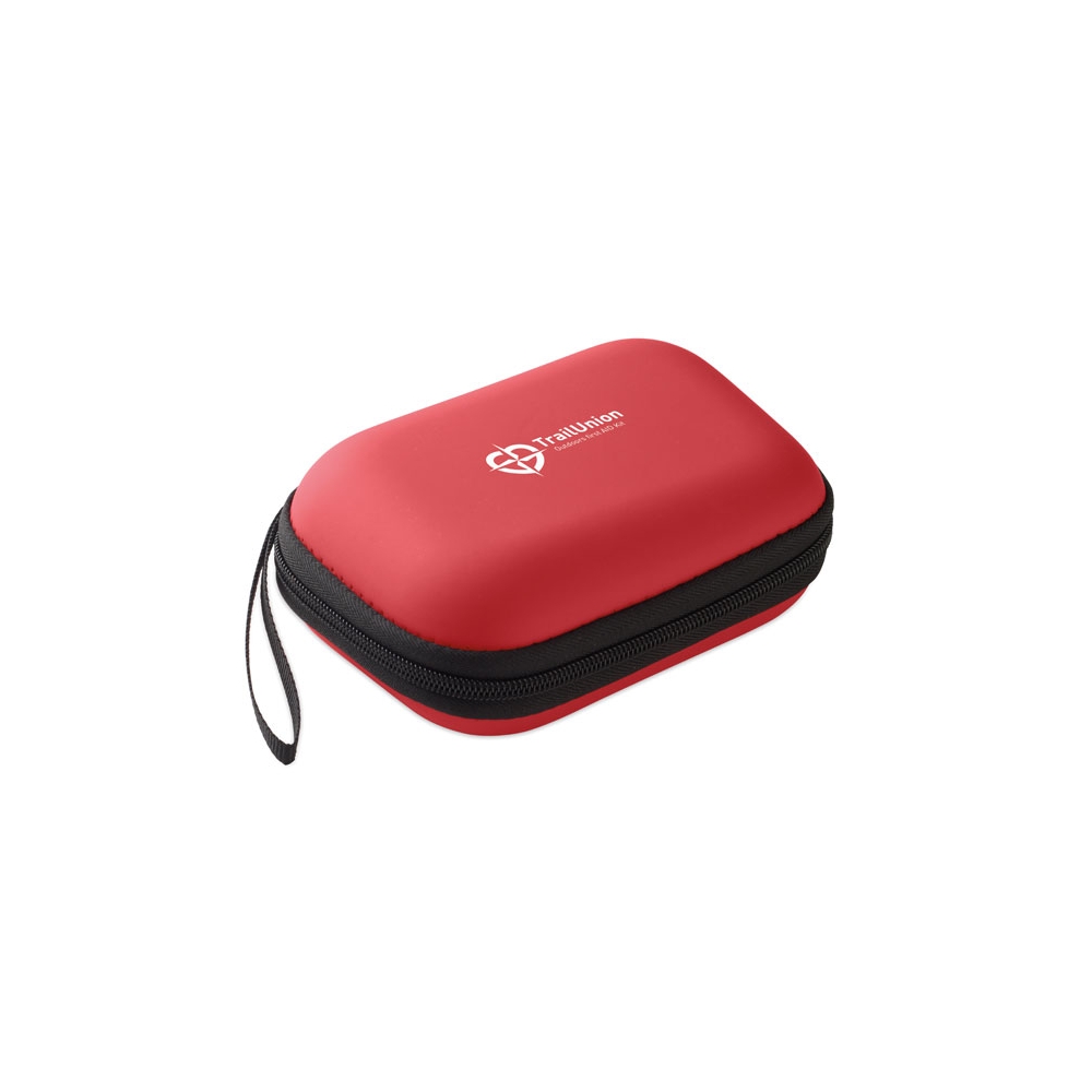 Ein kleiner, unsichtbarer Sanitäter begleitet Sie, wenn Sie das Erste-Hilfe-Set im dekorativen, rot-weißen Logic-Etui in der Tasche haben. Platzsparend untergebracht, ist es ideal für die Erstversorgung nach kleinen Unfällen geeignet. Das Erste-Hilfe-Set enthält: 2 Mullkompressen 75x75 mm, 1 Paar Latexhandschuhe, 12 schmale Heftpflaster, 2 breite Heftpflaster, 1 Rolle Heftpflaster, 1 elastische 8 cm Fixierbinde 4 m, 1 elastische 6 cm Fixierbinde 4 m, 1 Verbandspäckchen 80x100 mm, 1 Schere. Größe: ca. 134 x 175 x 51 mm. Gewicht: ca. 340 g. Werbeanbringung mittels Druck möglich (Preis und Mindestbestellmenge auf Anfrage).