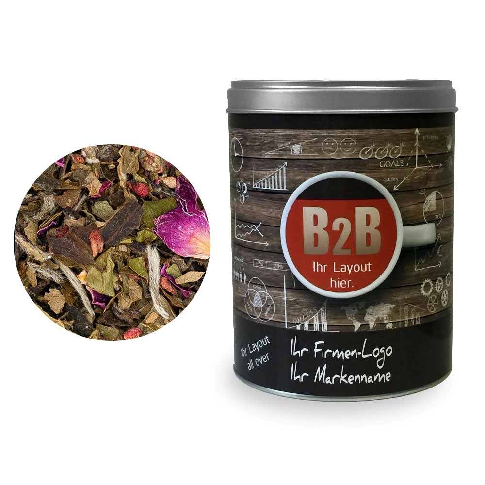 Zutaten: Rooibos, Kokosnussraspeln, Aromen, Orangenschalen, Himbeerstücke, Brombeerblätter, Kornblumenblüten