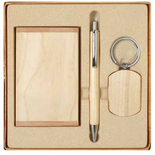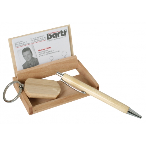 Inhalt: Schlüsselanhänger, Druckkugelschreiber, Visitenkartenhalter, klappbar - alles aus Holz. Das exklusive Schreibtisch-Set aus Holz erhalten Sie in ansprechender Geschenkbox. Es ist eine beliebte Geschenkidee für jede Gelegenheit. Mit Ihrem Firmenaufdruck versehen, wird das Set zum hochwertigen Geschenkartikel für Geschäftsfreunde, Kunden und Mitarbeiter! Nennen Sie uns Ihre Wünsche und wir erfüllen sie!