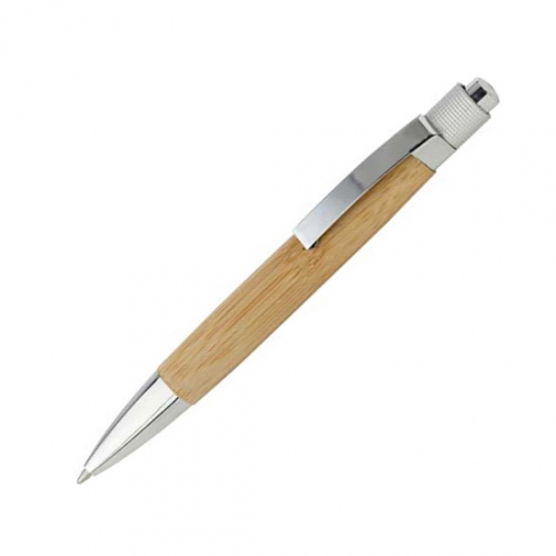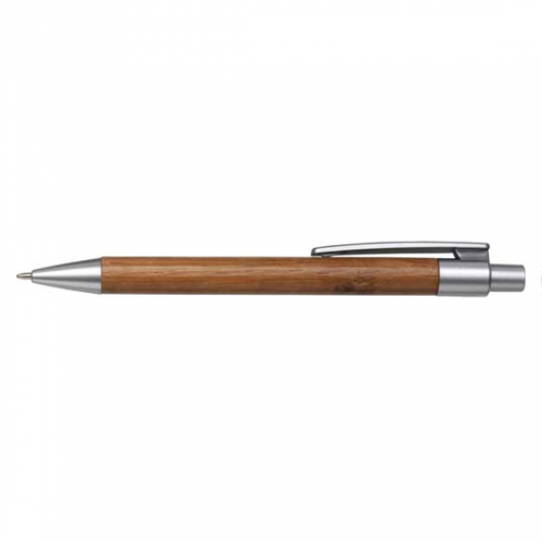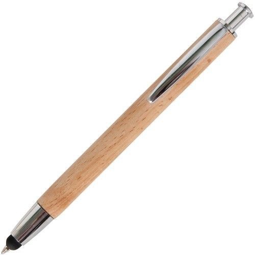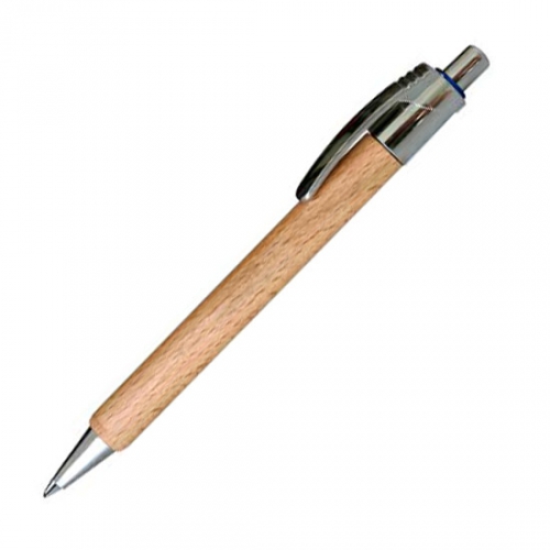 Holz-Druckkugelschreiber mit vernickeltem Metallclip und Metallspitze. Schaft aus schutzlackiertem PEFC-zertifiziertem Buchenholz. Mit X 20 Mine schwarz schreibend.