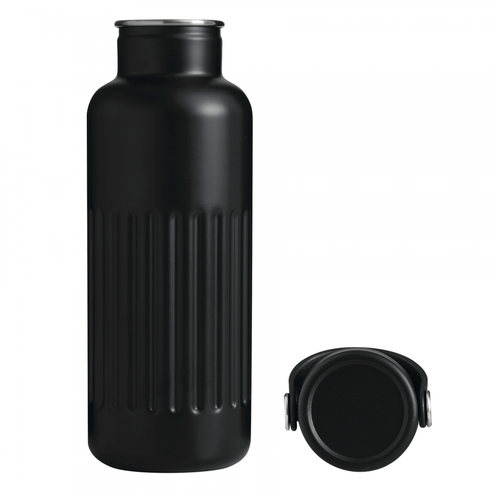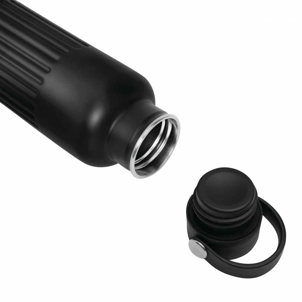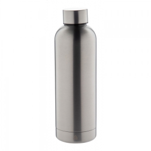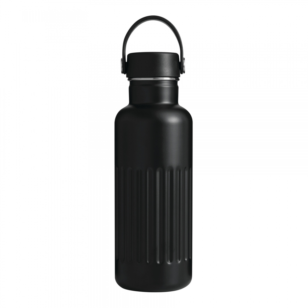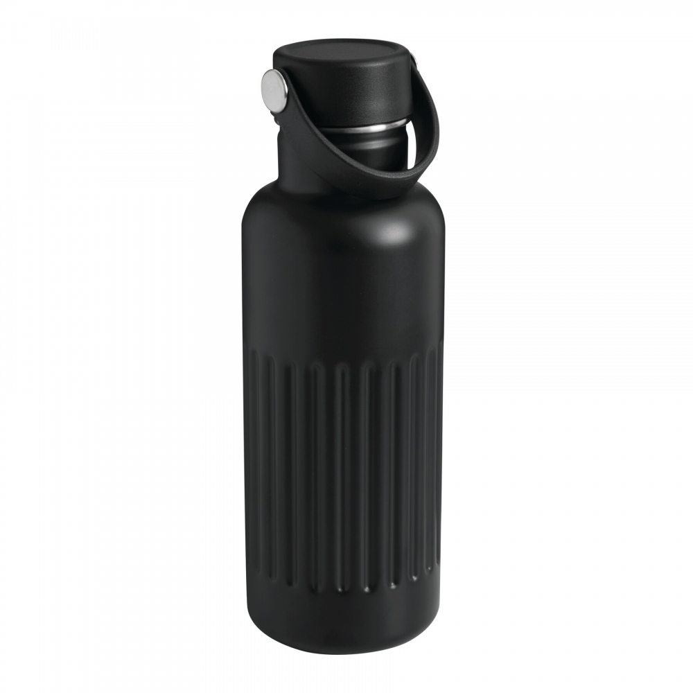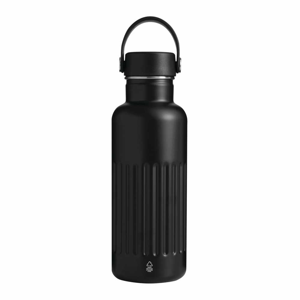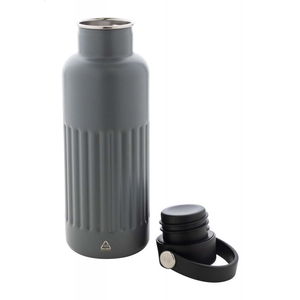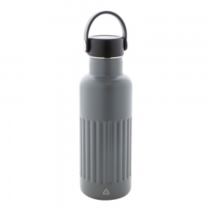 Artikel-Nr: AND800145-07Doppelwandige, isolierte Vakuumflasche aus recyceltem Edelstahl mit vertikalen Rillen. Mit PP-Trinkdeckel und integriertem Tragegriff. Füllmenge: 540 ml.