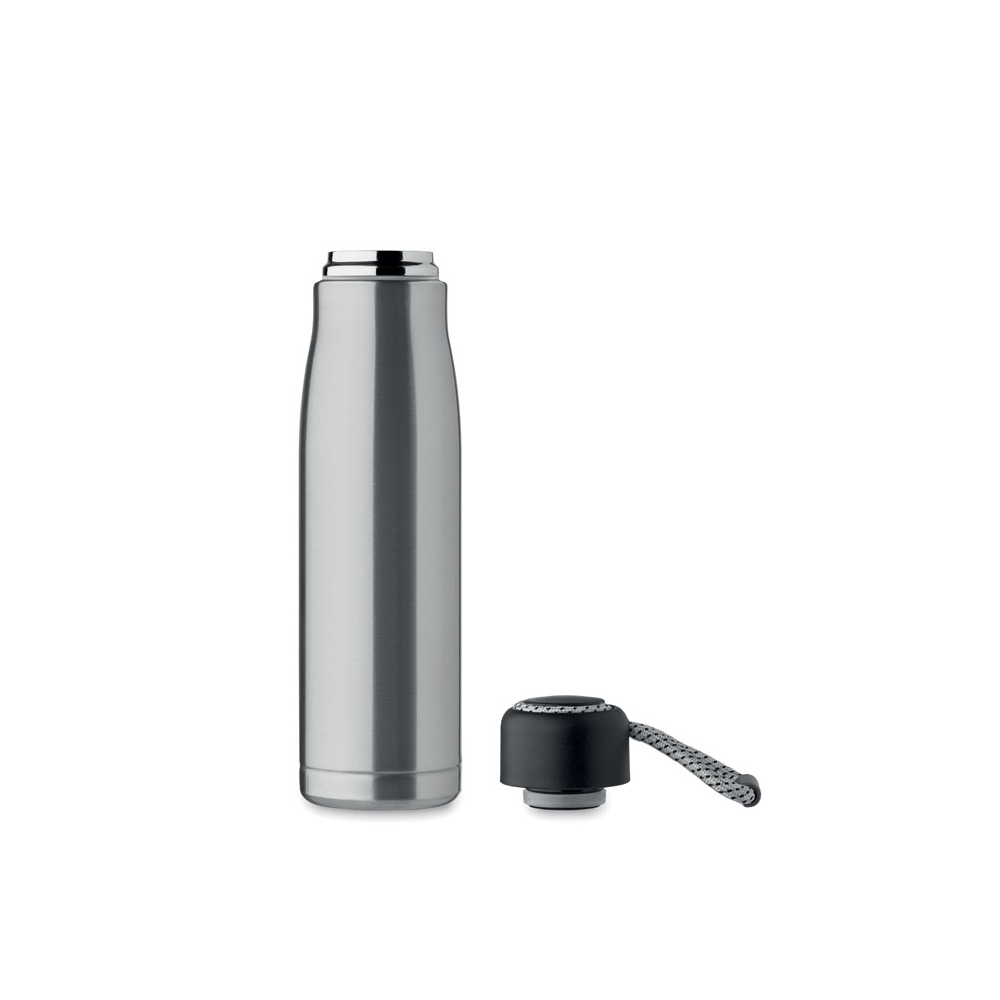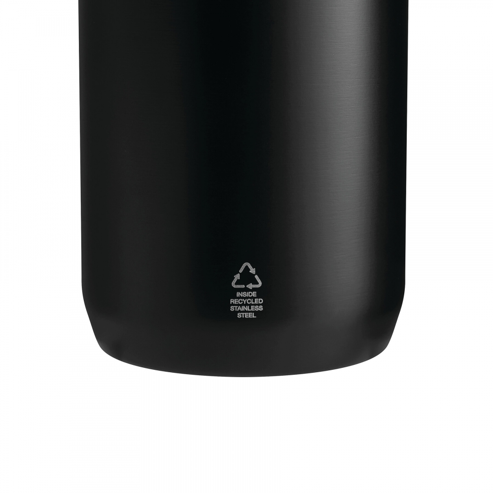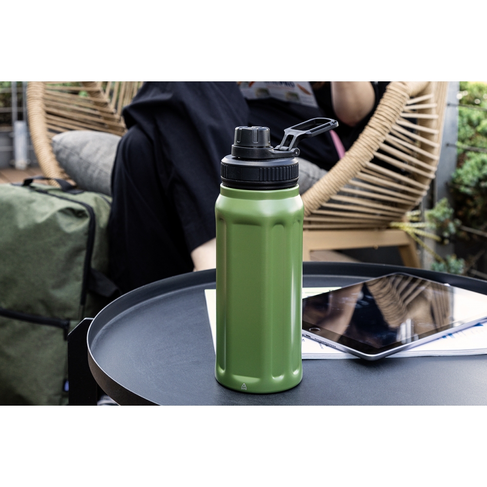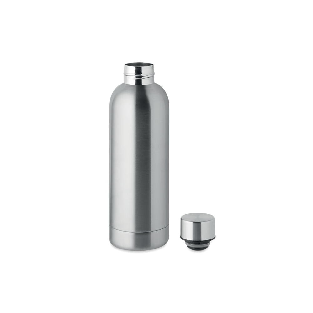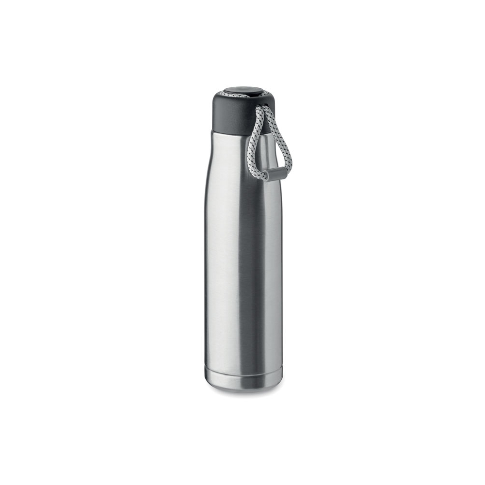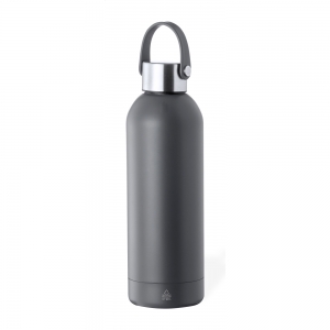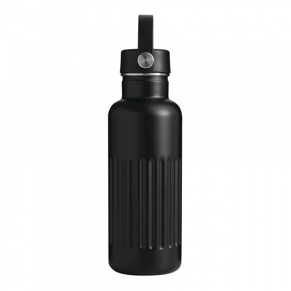 Artikel-Nr: AND800145-07Doppelwandige, isolierte Vakuumflasche aus recyceltem Edelstahl mit vertikalen Rillen. Mit PP-Trinkdeckel und integriertem Tragegriff. Füllmenge: 540 ml.
