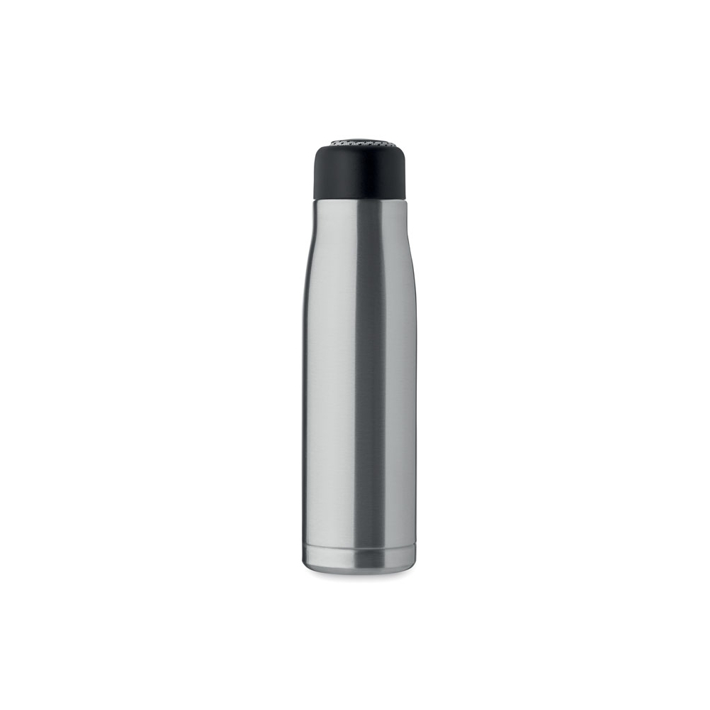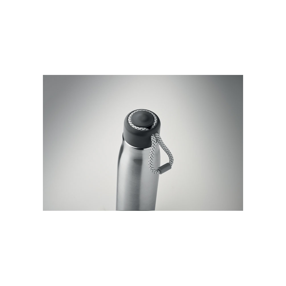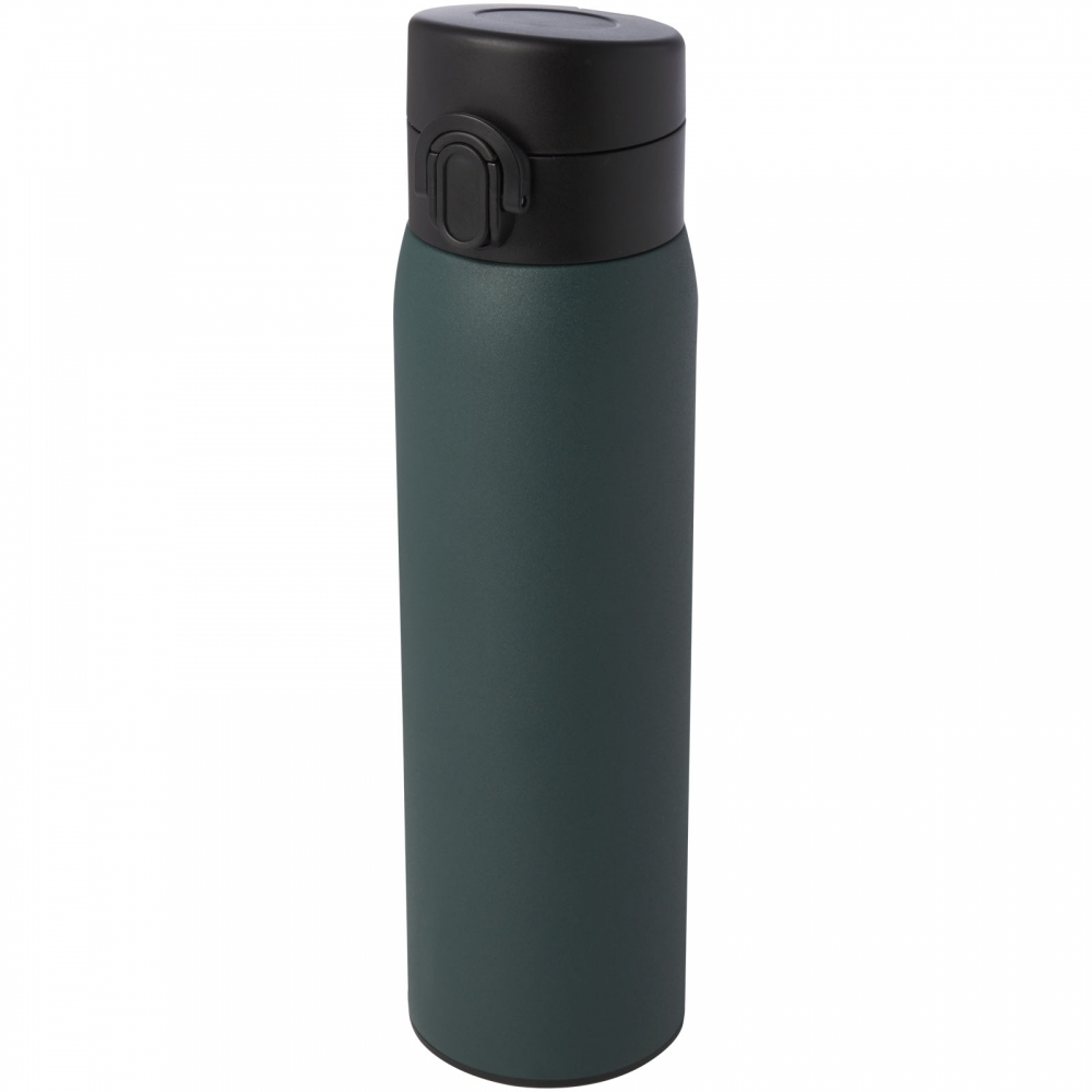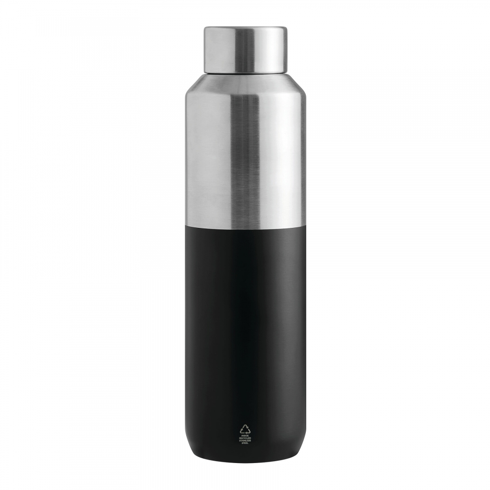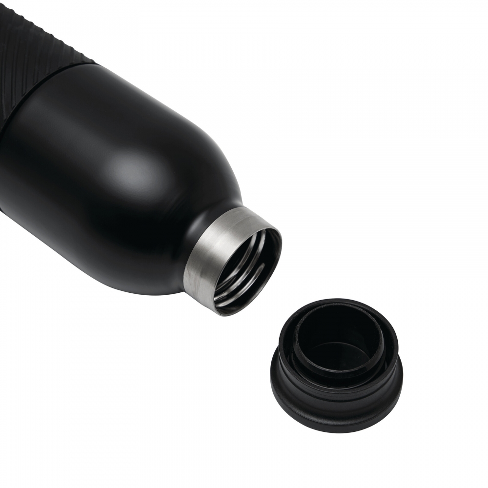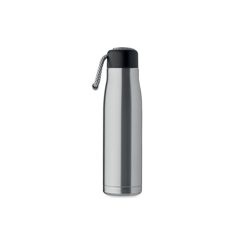 Artikel-Nr: AND800145-07Doppelwandige, isolierte Vakuumflasche aus recyceltem Edelstahl mit vertikalen Rillen. Mit PP-Trinkdeckel und integriertem Tragegriff. Füllmenge: 540 ml.