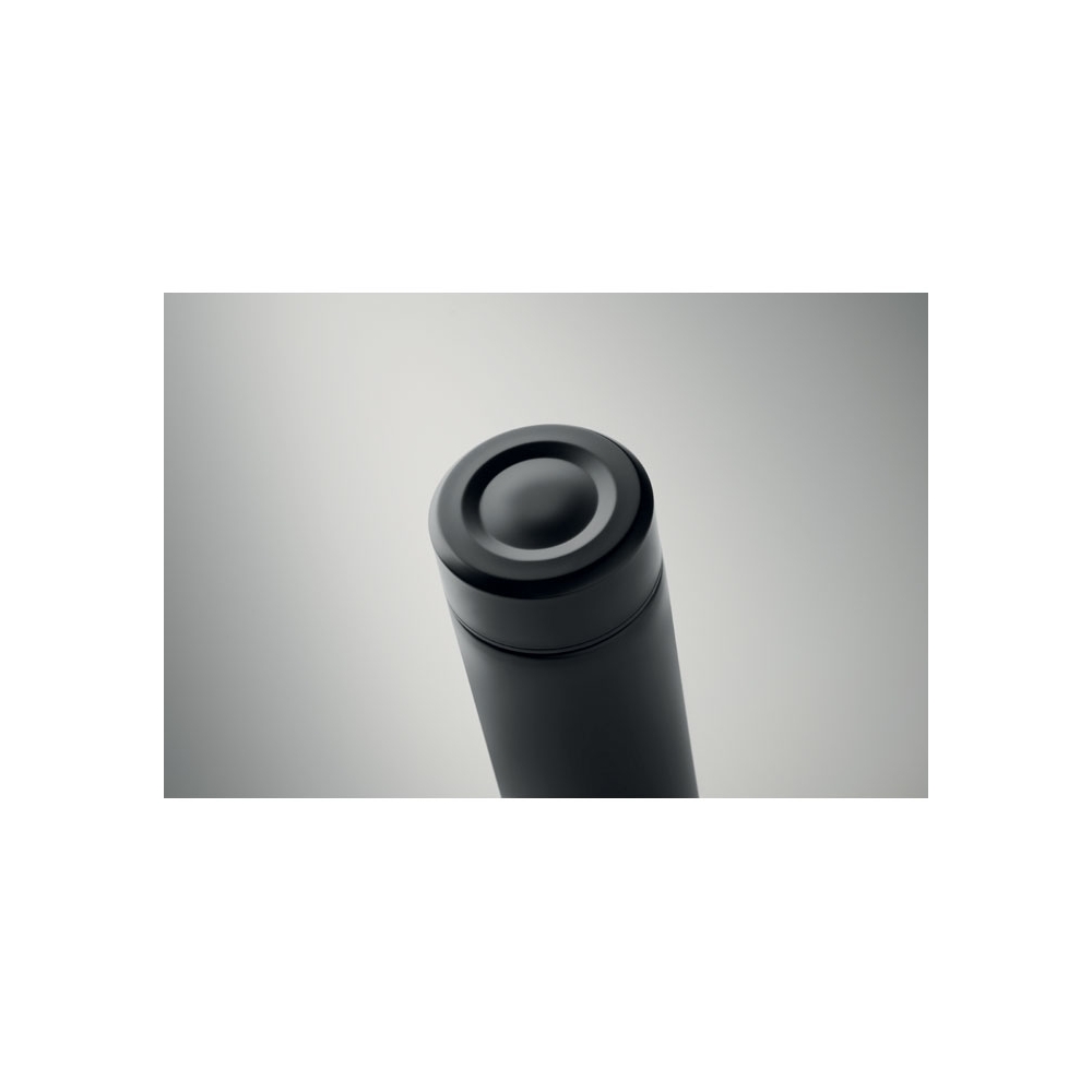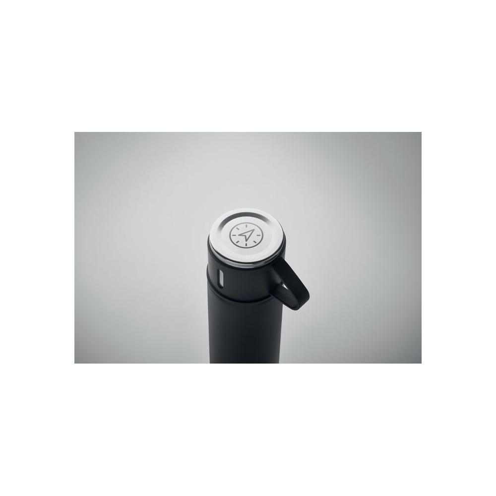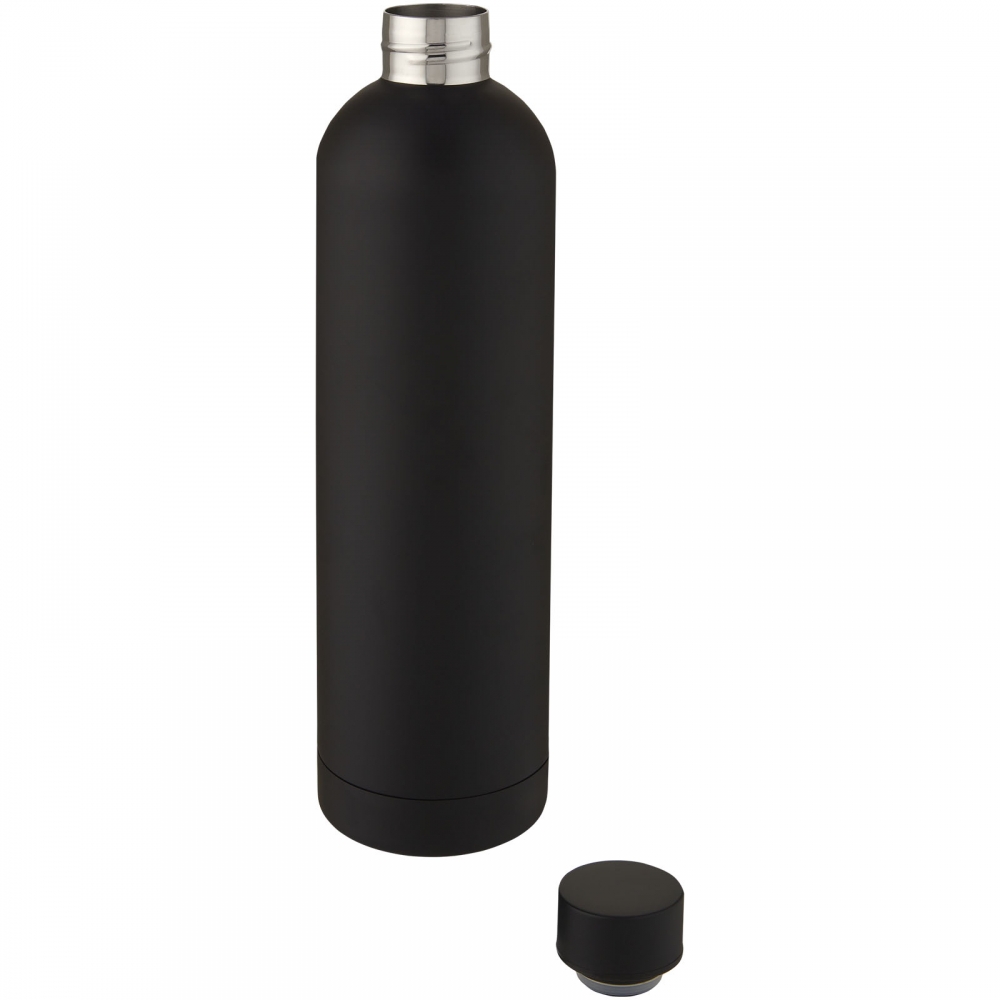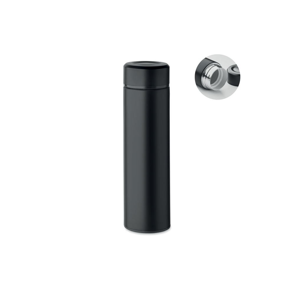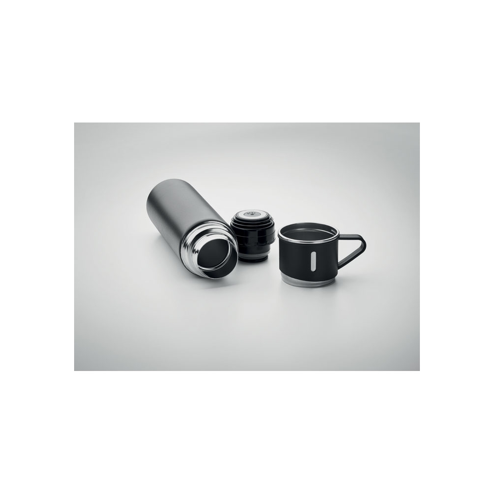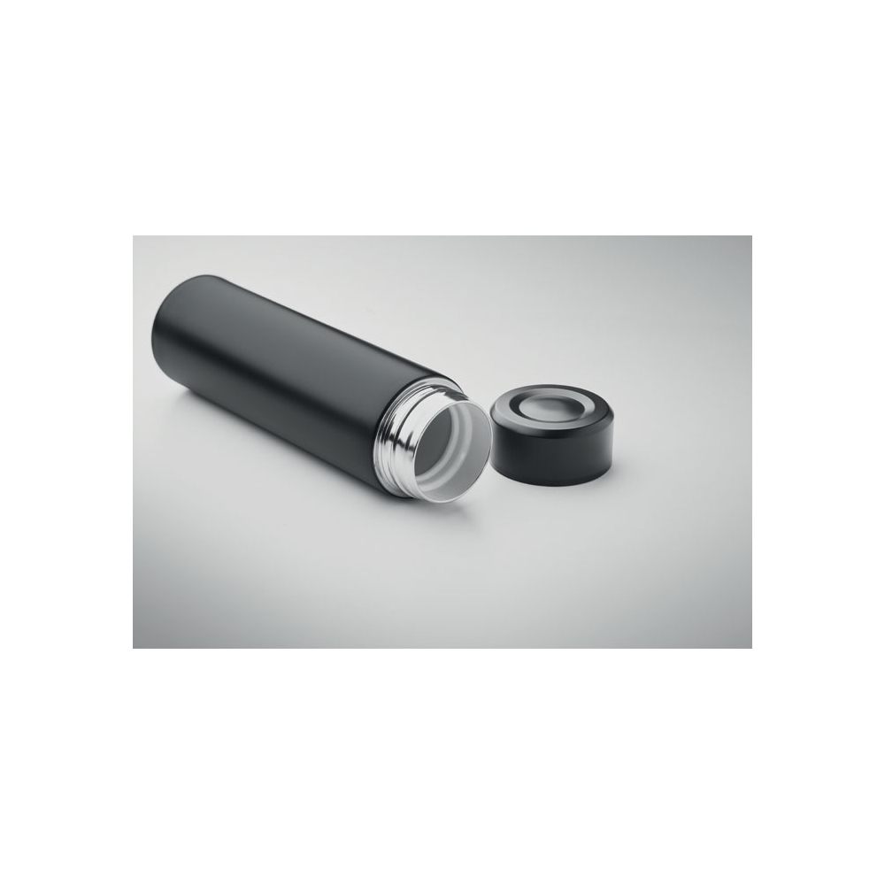 Artikel-Nr: AND800145-07Doppelwandige, isolierte Vakuumflasche aus recyceltem Edelstahl mit vertikalen Rillen. Mit PP-Trinkdeckel und integriertem Tragegriff. Füllmenge: 540 ml.
