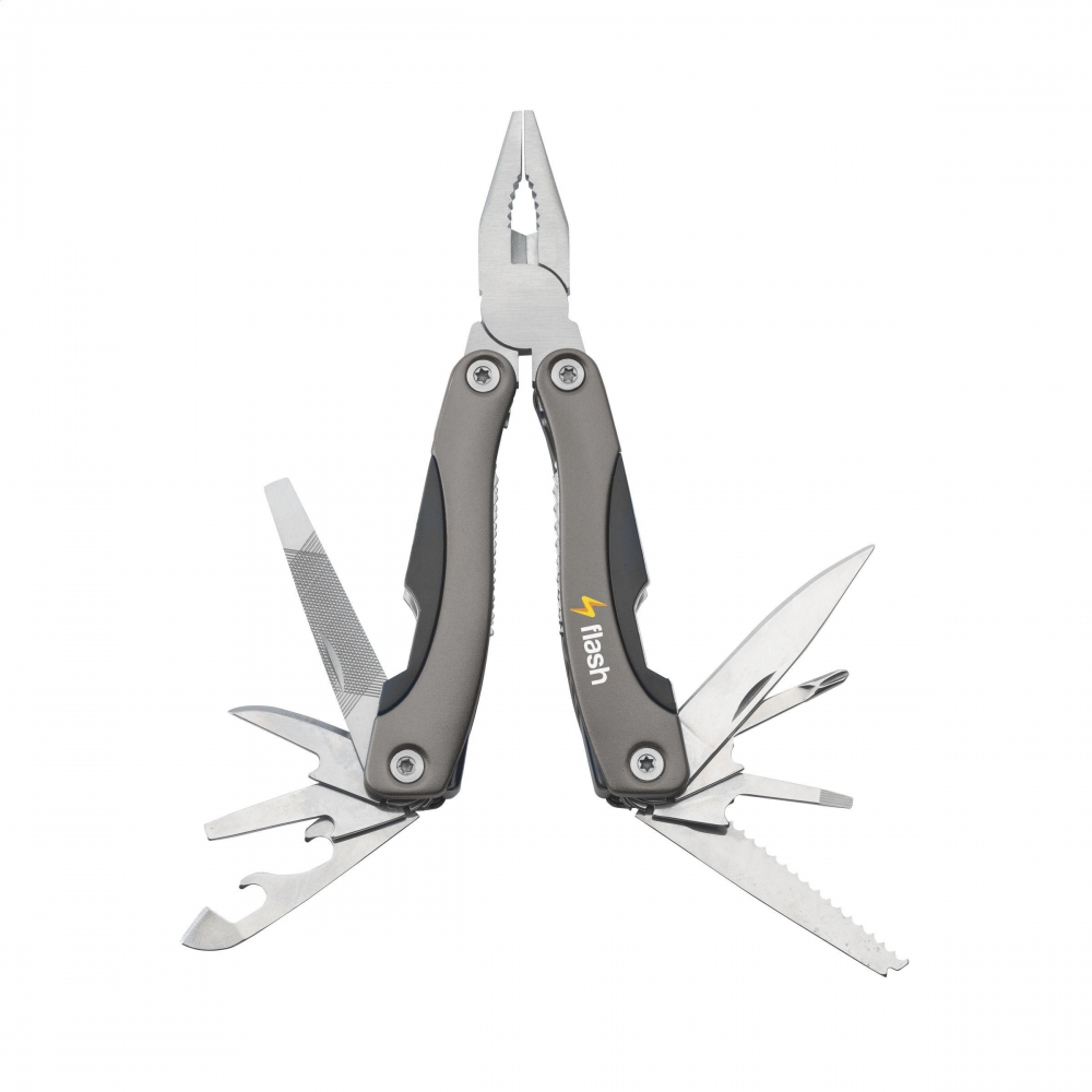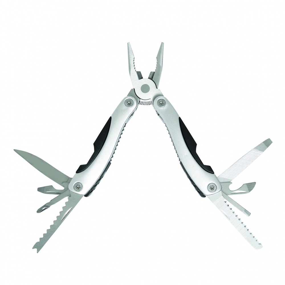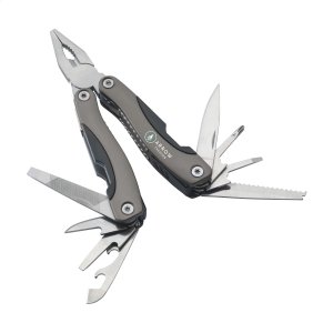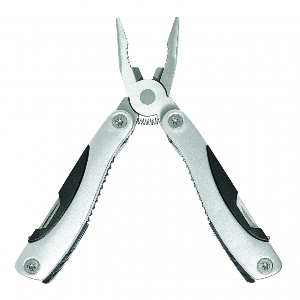 Kompakte Multizange aus Edelstahl mit Aluminiumhandgriff in Metallic-Look. 9-teilig mit 13 Funktionen: Zange, Isolierzange, 3 Schraubenzieher, Kreuzschraubenzieher, Feile, Säge/Fischentschupper, Messer, Reibahle, Dosenöffner und Kapselheber. In einem 600D Nylonetui.Beachten Sie, dass möglicherweise lokale Vorschriften für den Besitz und / oder das Tragen von Messern oder Multitools in der Öffentlichkeit gelten.