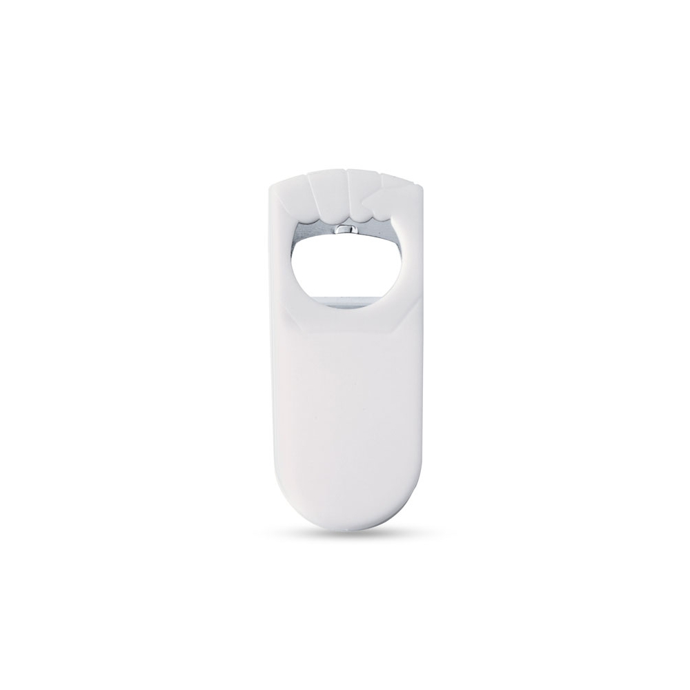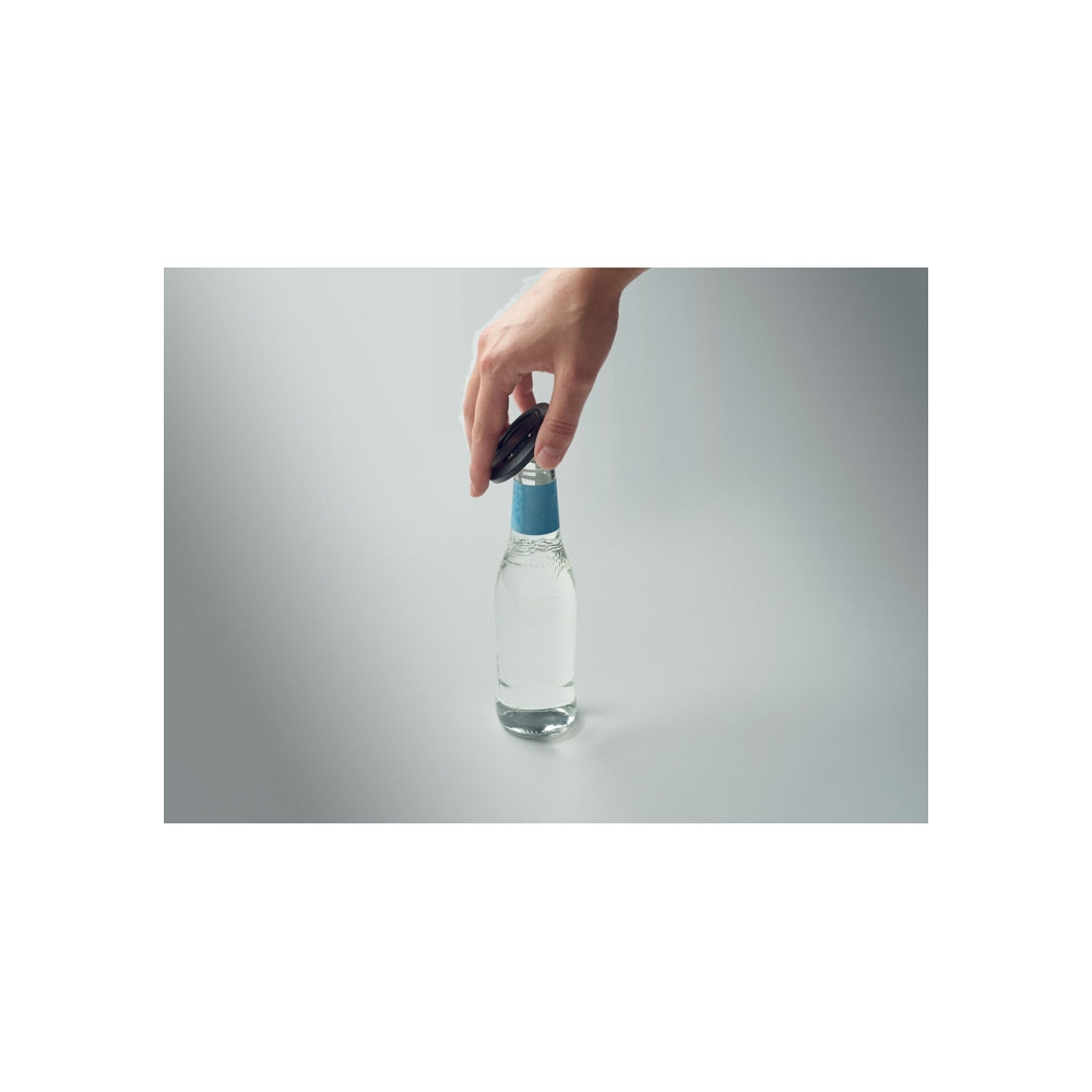 Innovativ und einfach in der Bedienung. Einfach auf die Flasche setzen, kurz nach unten drücken und nach dem Click wieder abnehmen - schon ist die Flasche offen. Dieser Flaschenöffner aus ABS und Edelstahl ist robust und biete eine große Werbefläche für Ihr Logo. Die Flaschenöffner sind in vielen Farben erhältlich. Sie werden einzeln verpackt in einem weißen Umkarton mit Sichtfenster. Maße: 86 x Ø52 mm Mindestmenge: 1000 Stück
