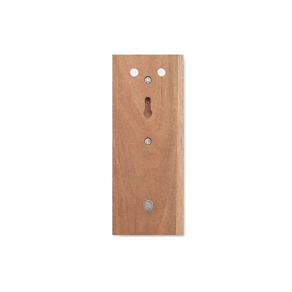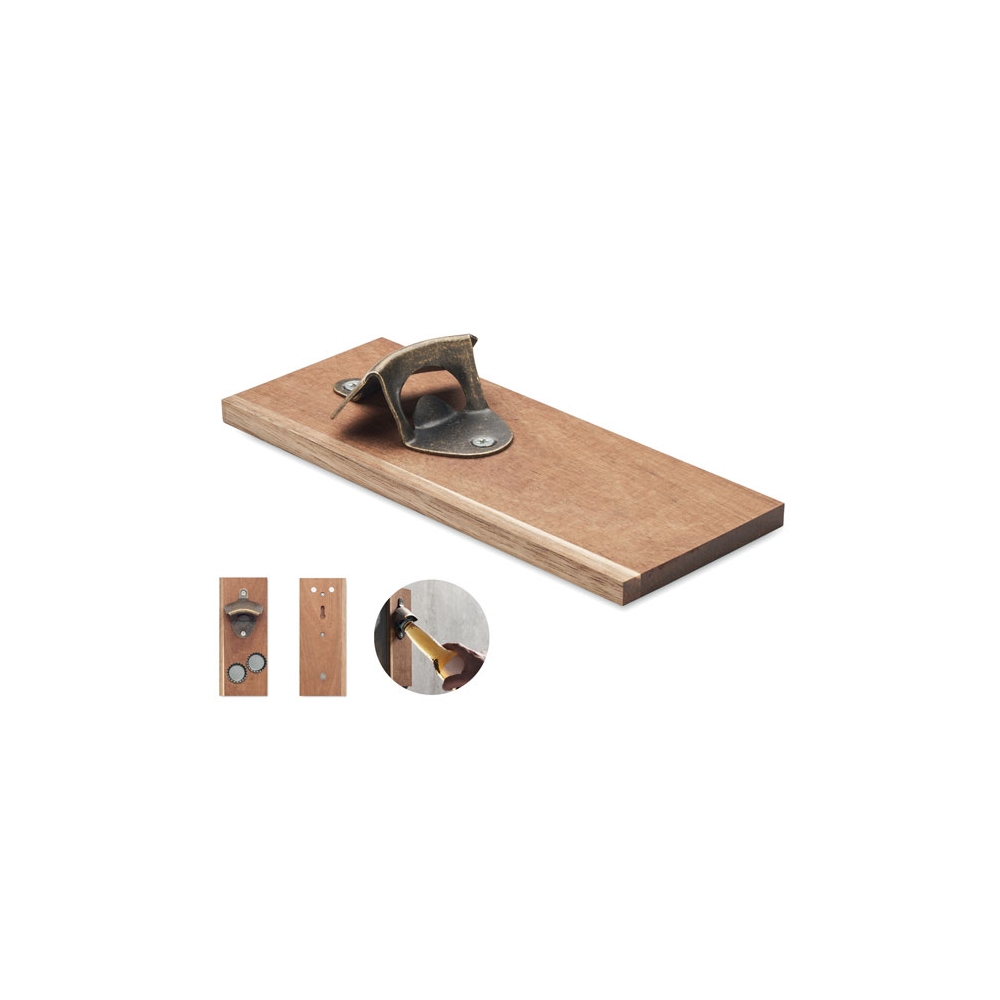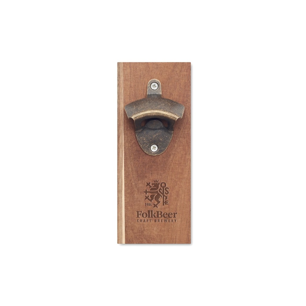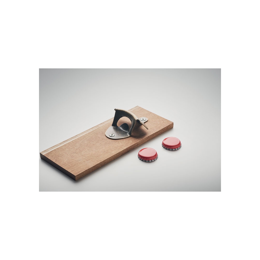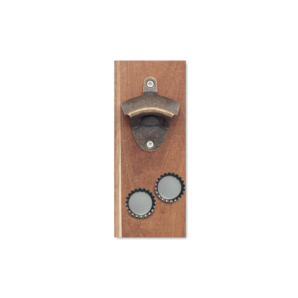 Kapselheber aus Akazienholz und Eisen. Mit starkem Magnet zum Auffangen der Kronkorken und zur Befestigung am Kühlschrank.