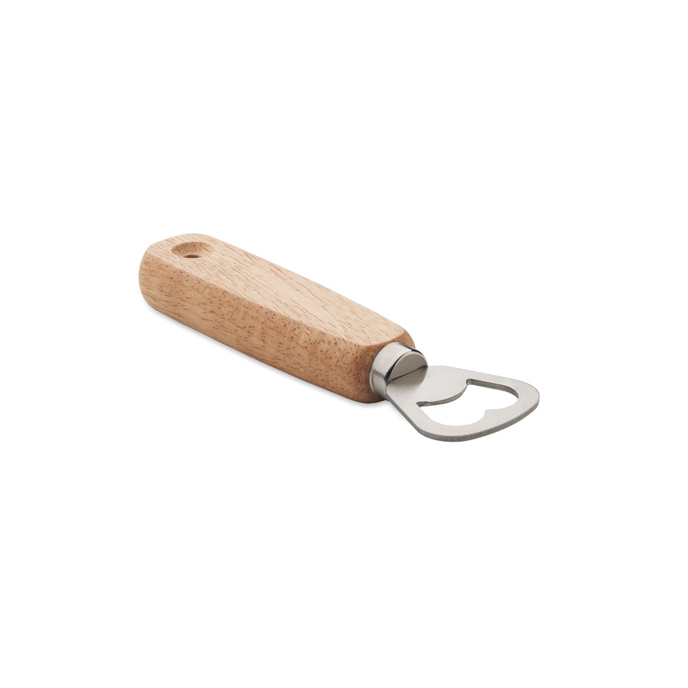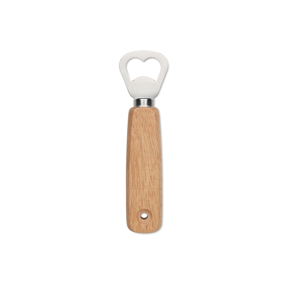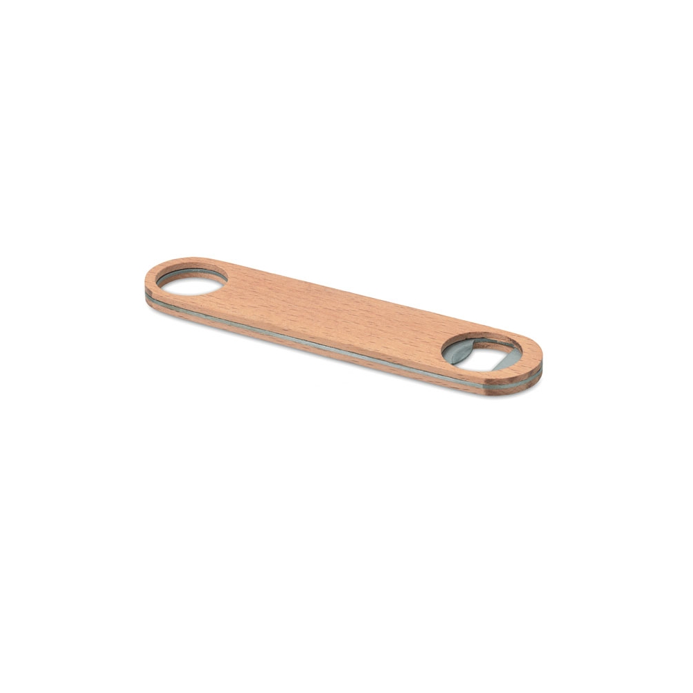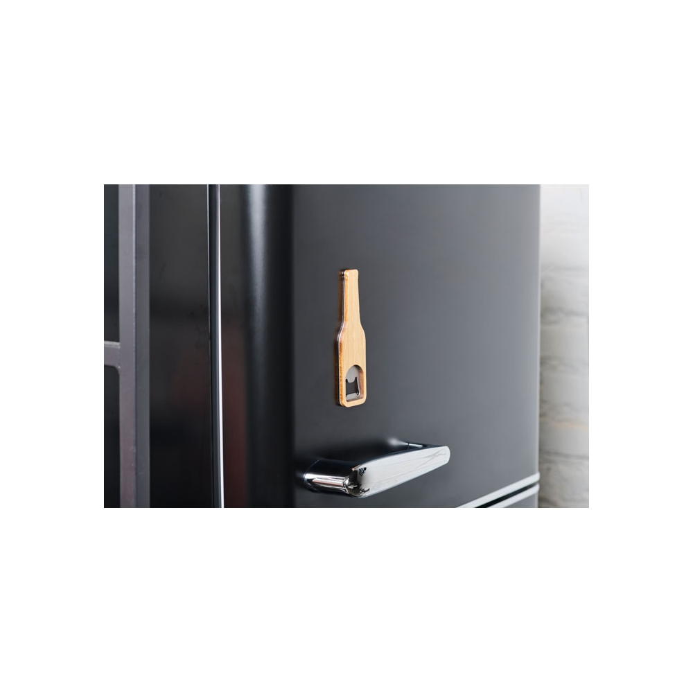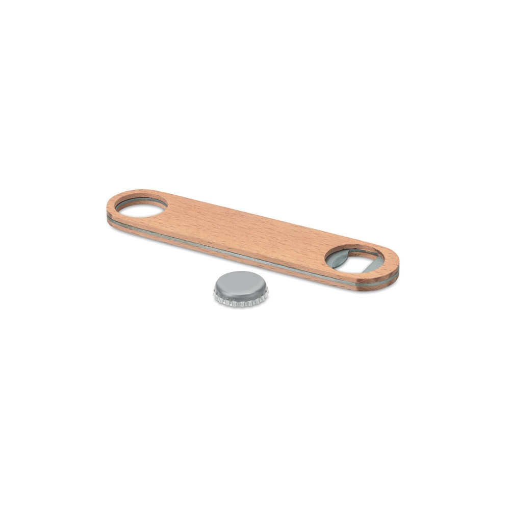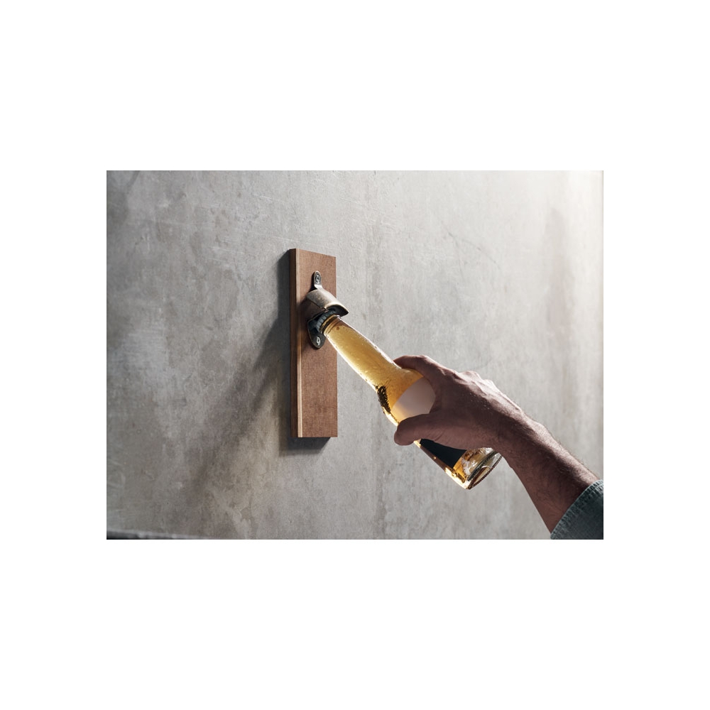 Flacher Flaschenöffner aus Edelstahl und Holz. Eignet sich aufgrund des Loches perfekt für kleine Spinner-Shows hinter der Bar. Außerdem gut an magnetischen Oberflächen zu befestigen.