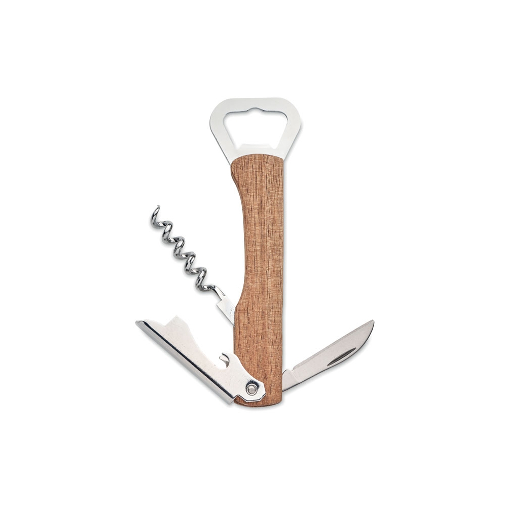 3in1 Multifunktionstool mit Griffteil aus Bambus und Schlüsselring. Inkl. Kapselheber, Korkenzieher und Taschenmesser.