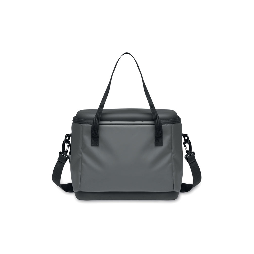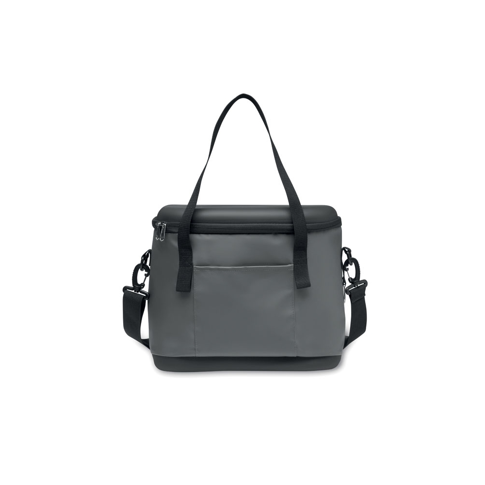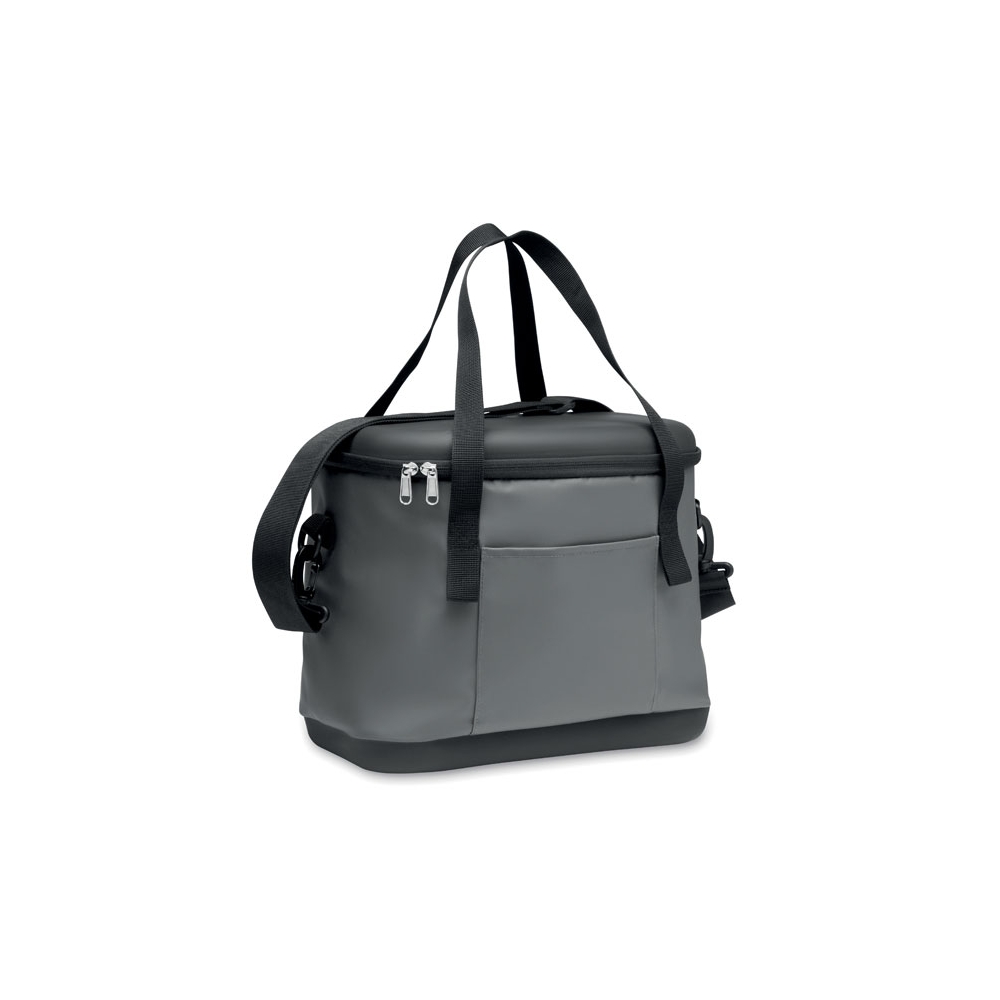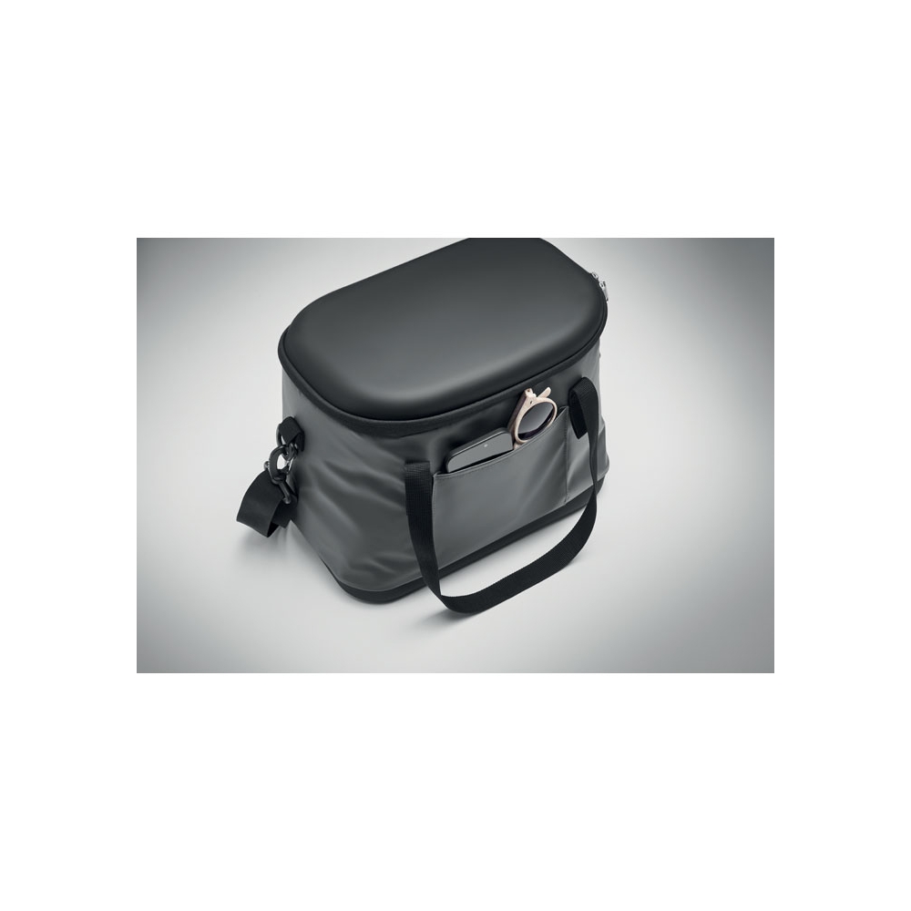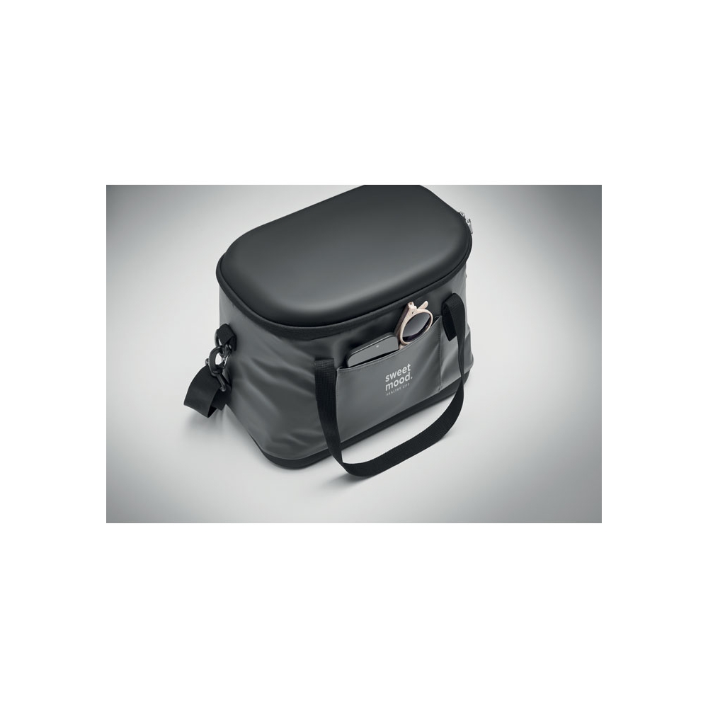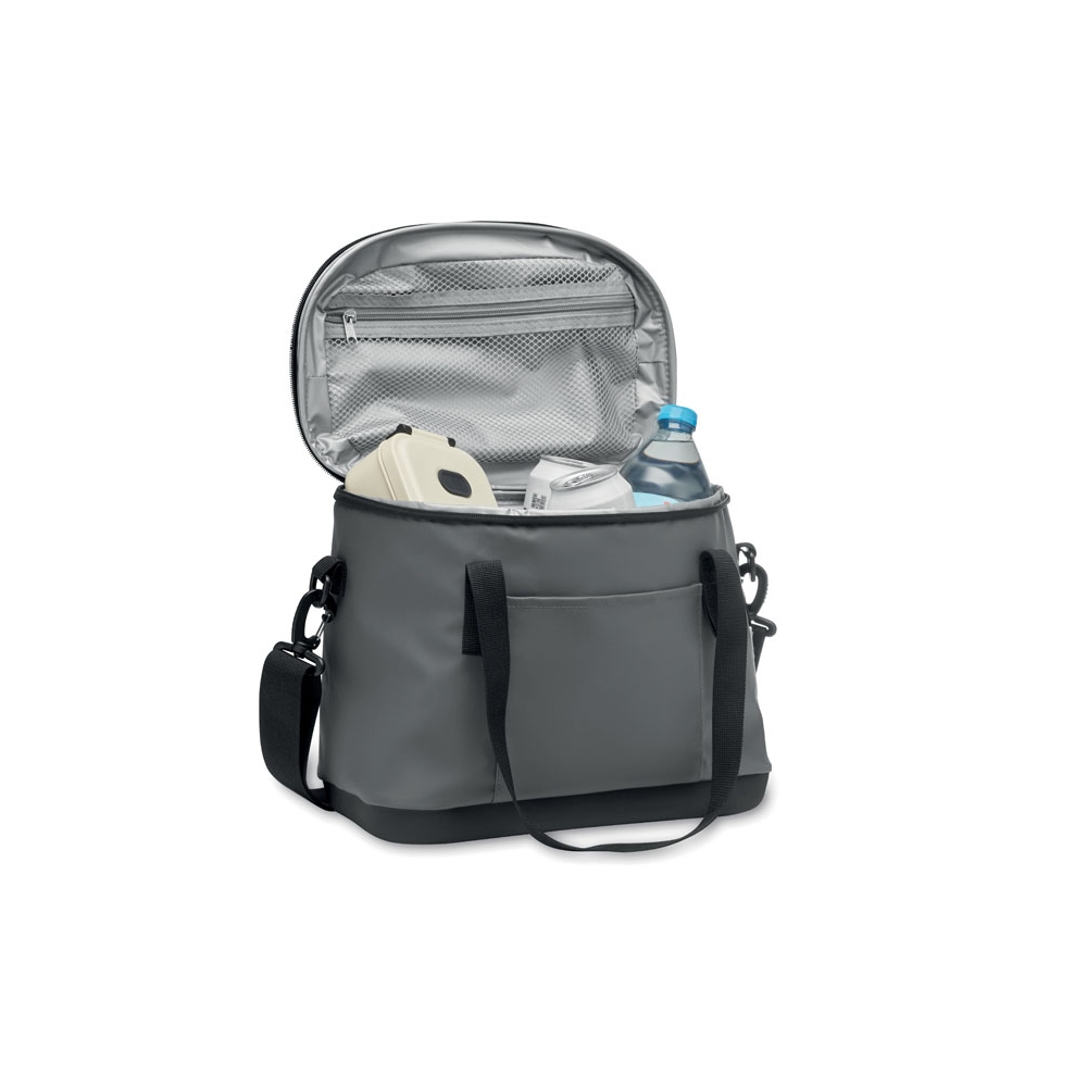 Kühltasche aus 50C-Plane. Ober- und Unterseite aus festem PEVA. Front- und Innentasche aus Mesh. Isoliermaterial: PE-Schaumstoffschicht. Inkl. 2 Griffe und verstellbarer, abnehmbarer Gurt. Seitlicher Kapselheber. Füllmenge: 16L.