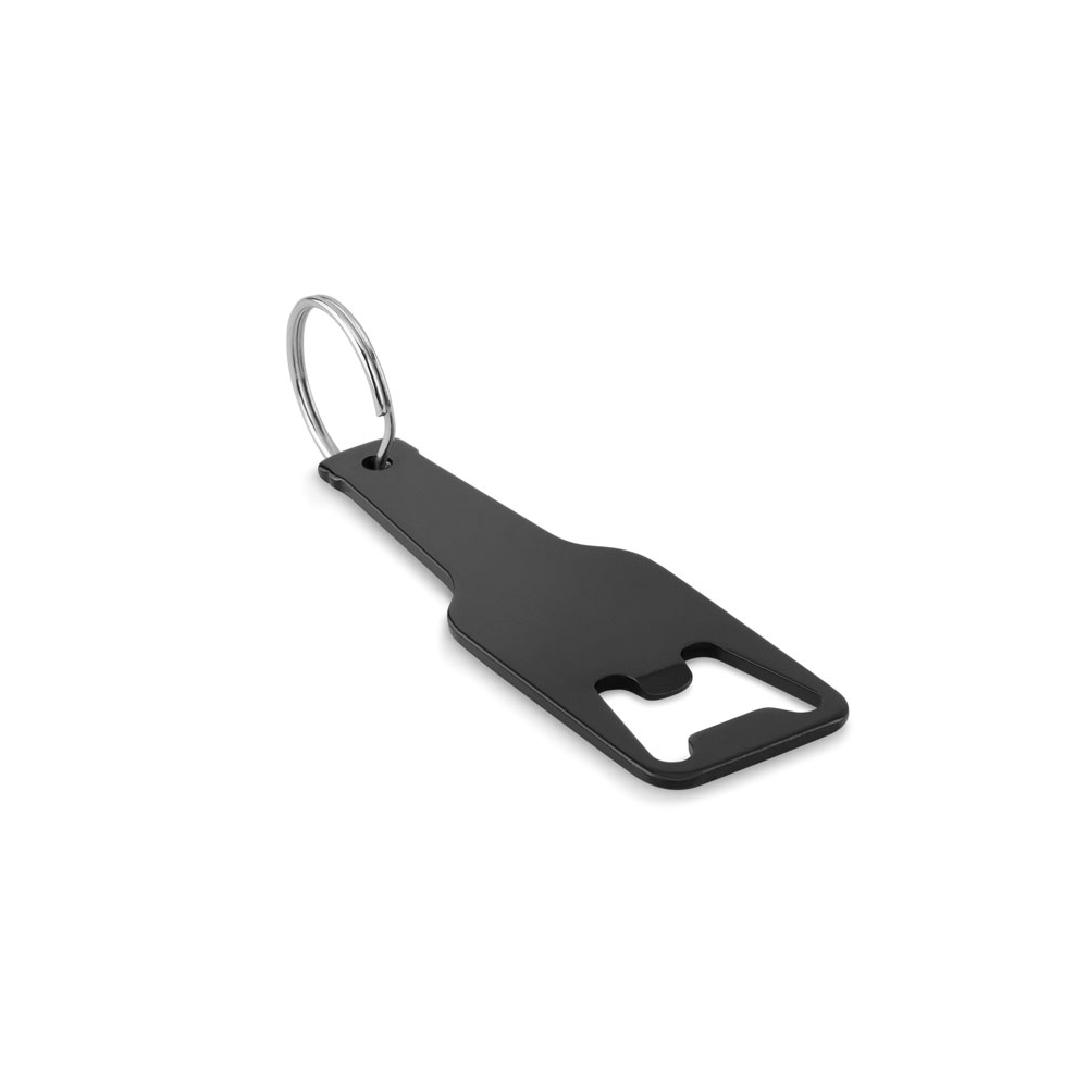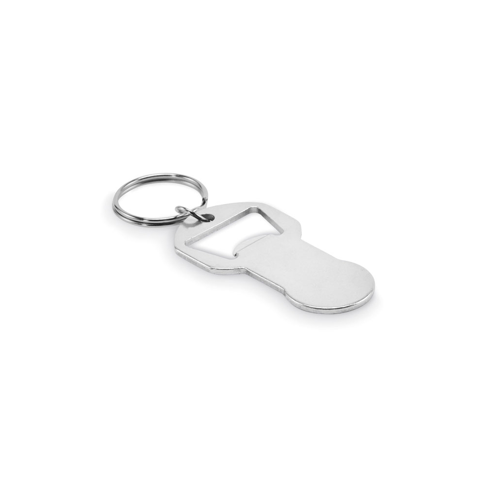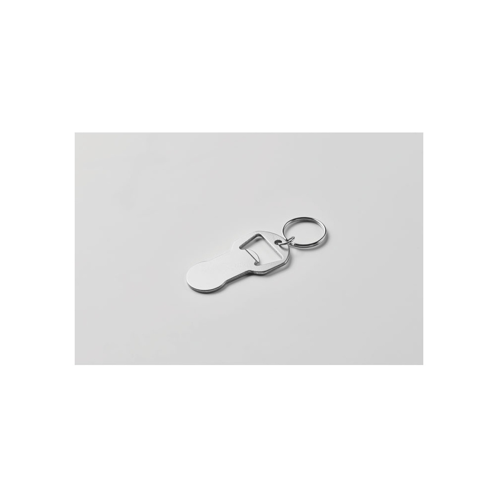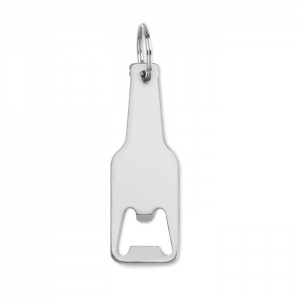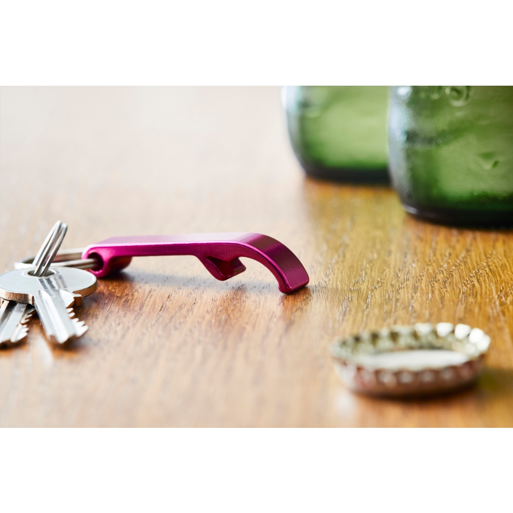 Schlüsselring mit Kapselheber in Form einer Flasche. Aluminium.