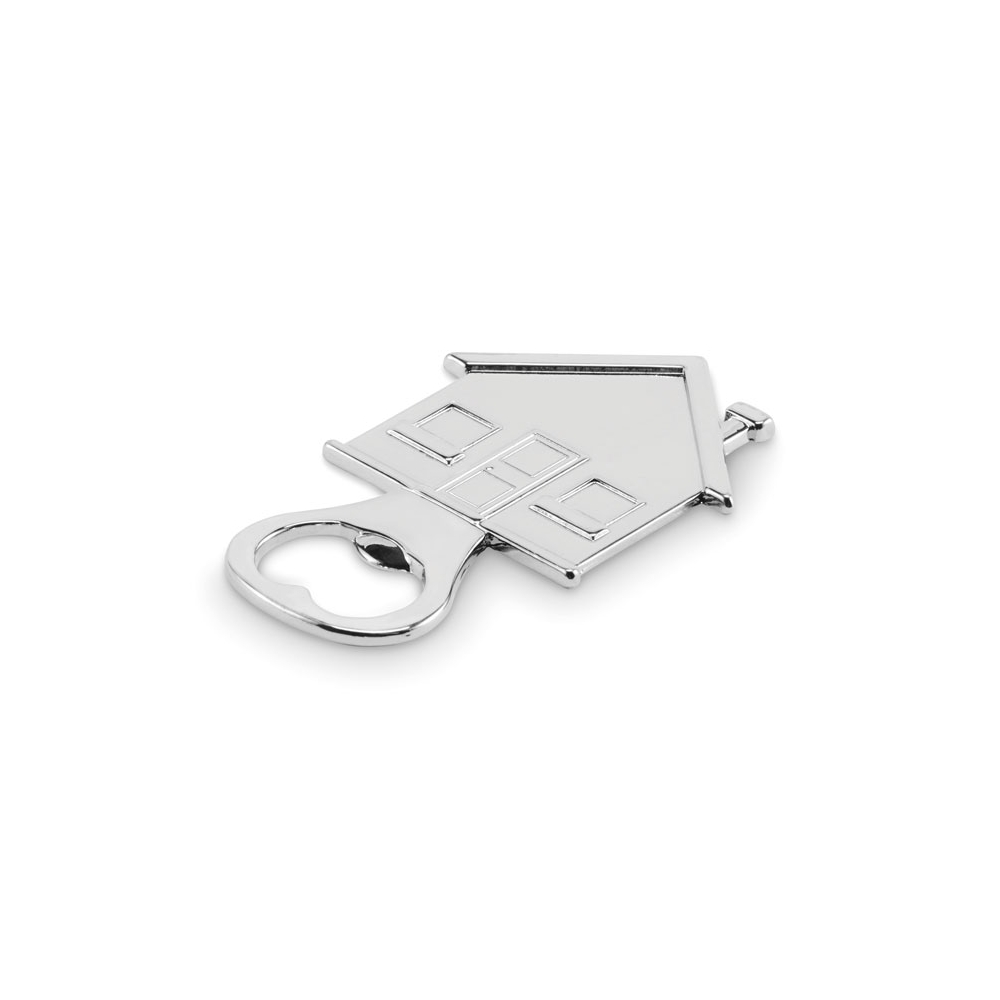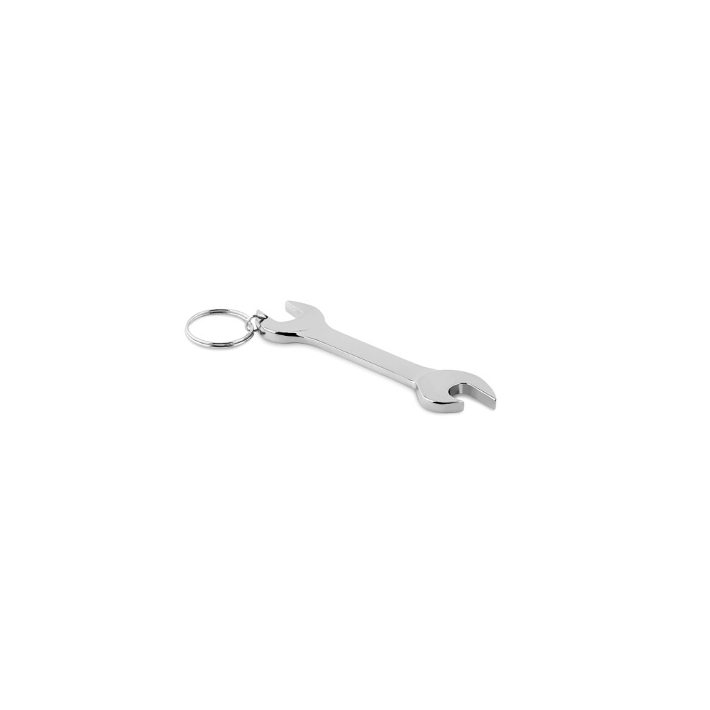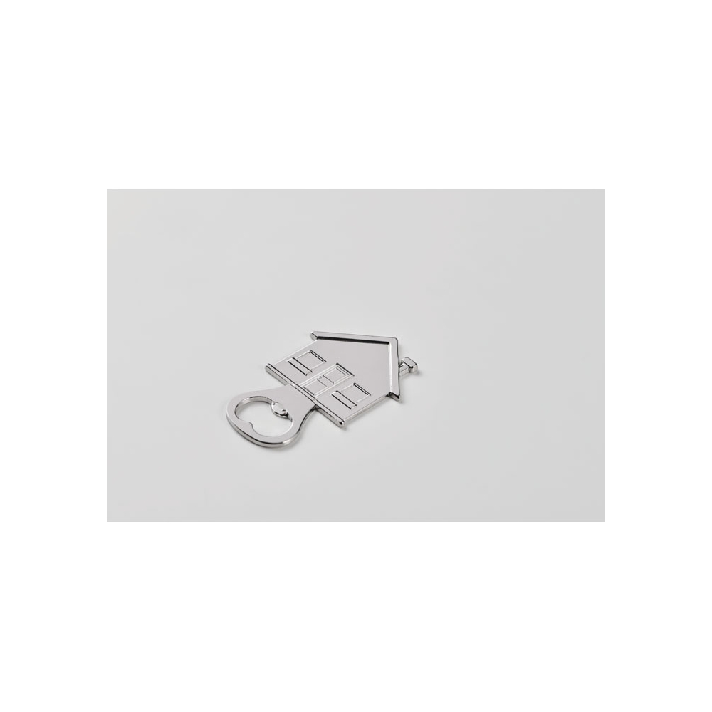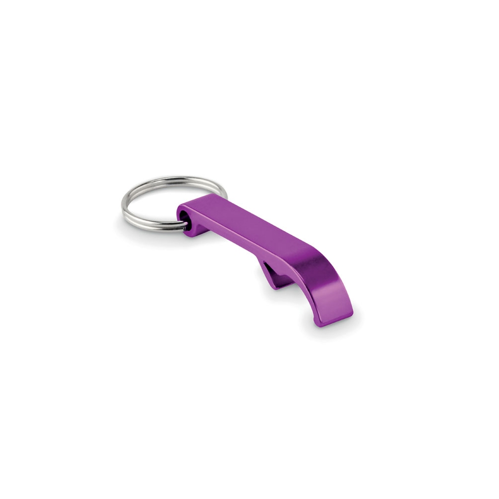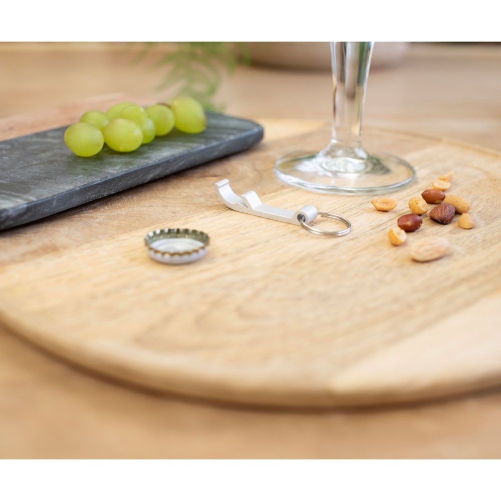 Schlüsselring mit Kapselheber in Form einer Flasche. Aluminium.