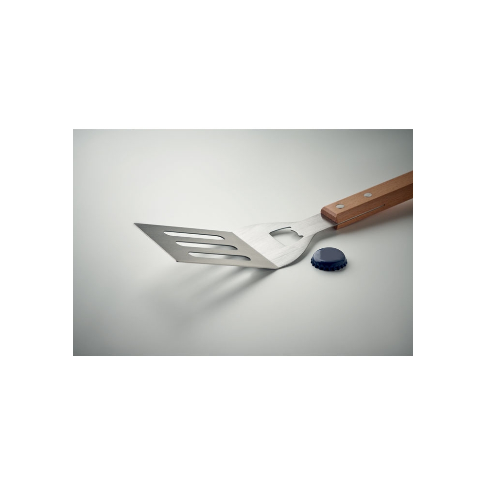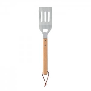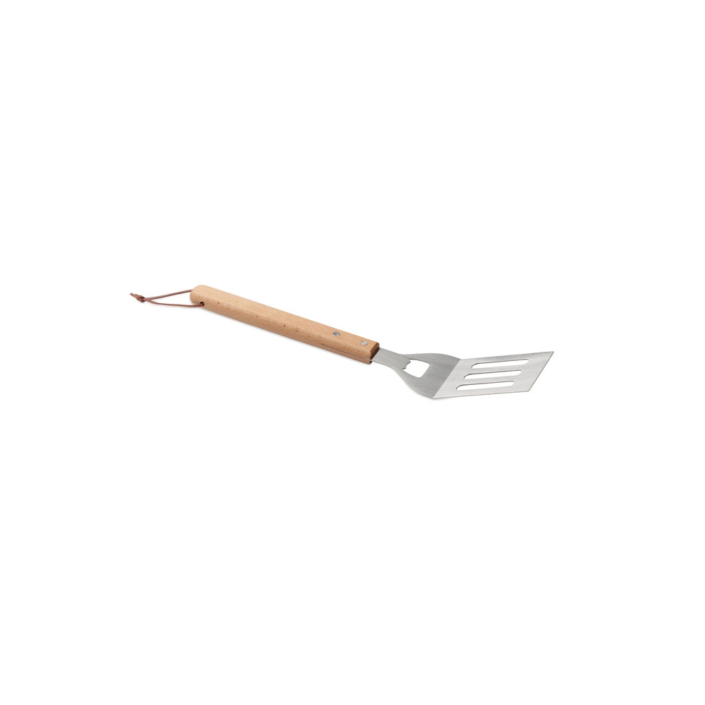 Grillspachtel aus Edelstahl mit Griff aus Buchenholz. Integrierter Kapselheber. Inklusive Aufhänger aus PU zur praktischen Aufbewahrung.
