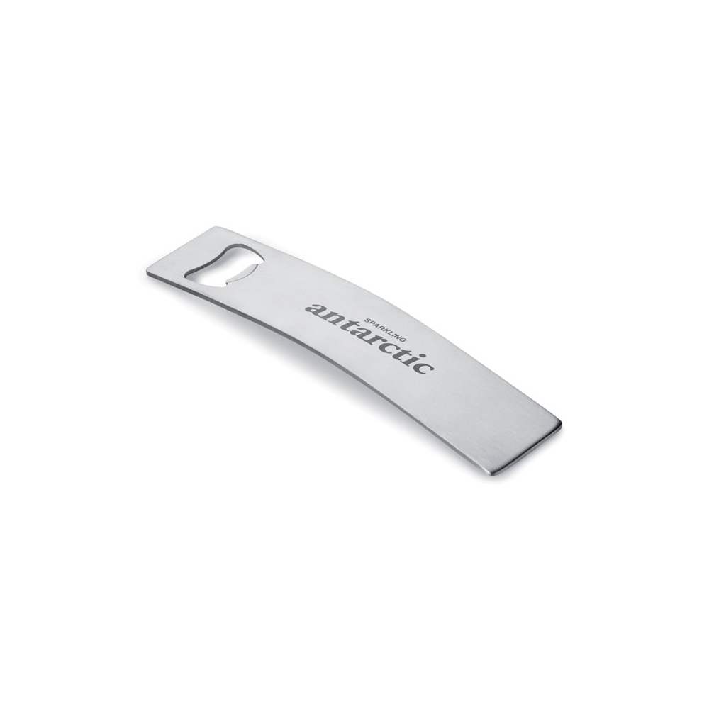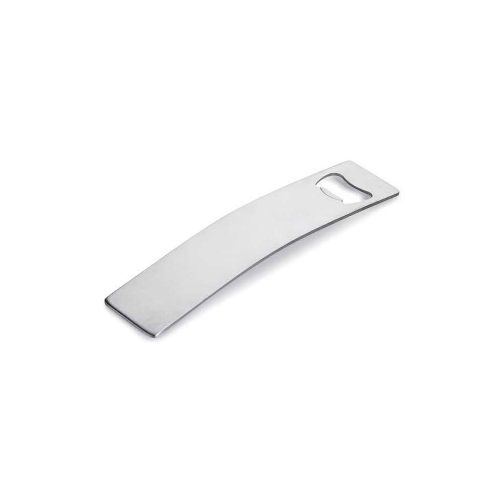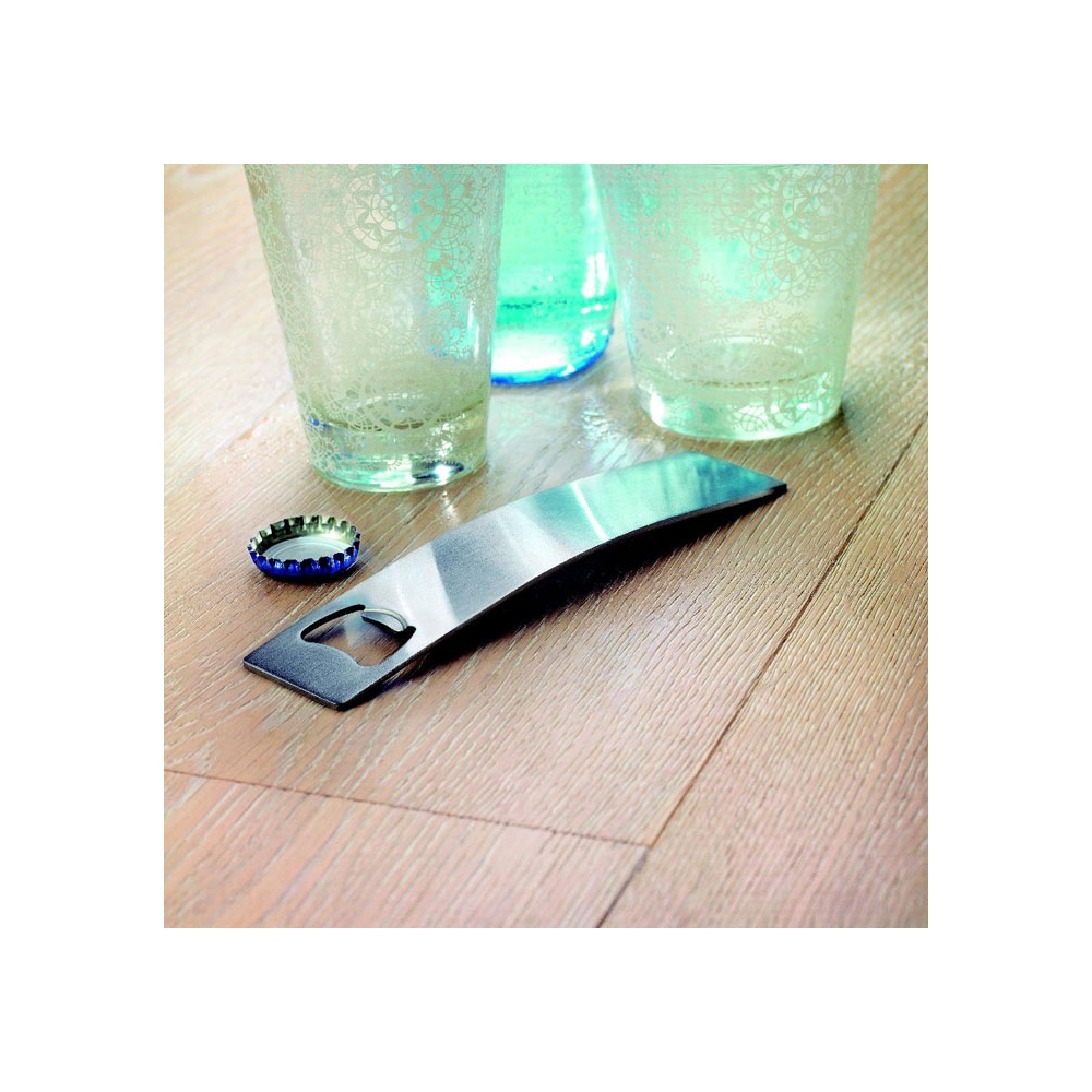Einfach, aber wirkungsvoll. Flacher Flaschenöffner aus Edelstahl. Eignet sich aufgrund des Loches perfekt für kleine Spinner-Shows hinter der Bar. Außerdem gut an magnetischen Oberflächen zu befestigen.